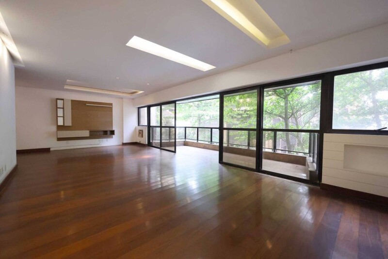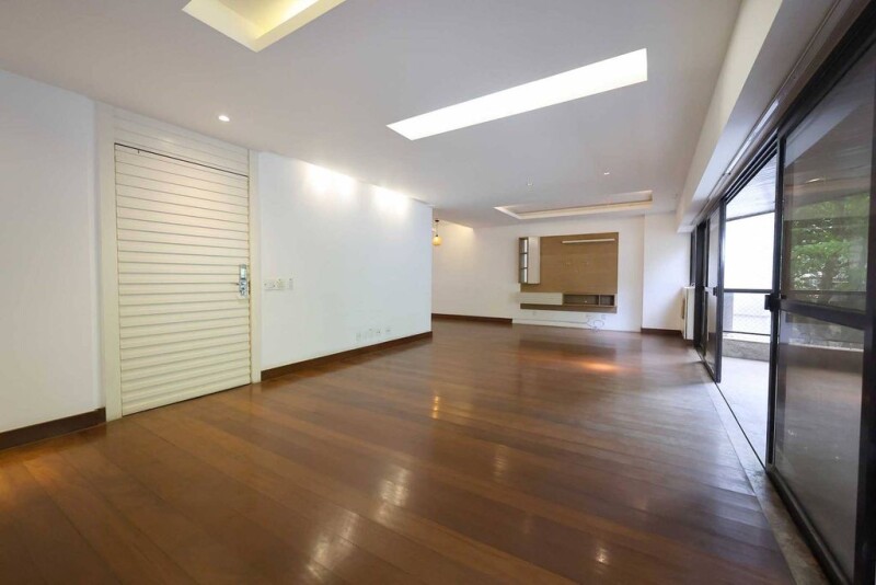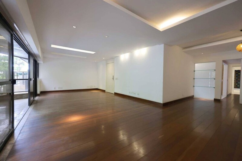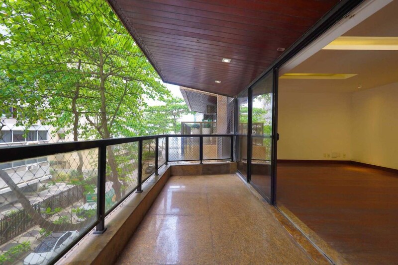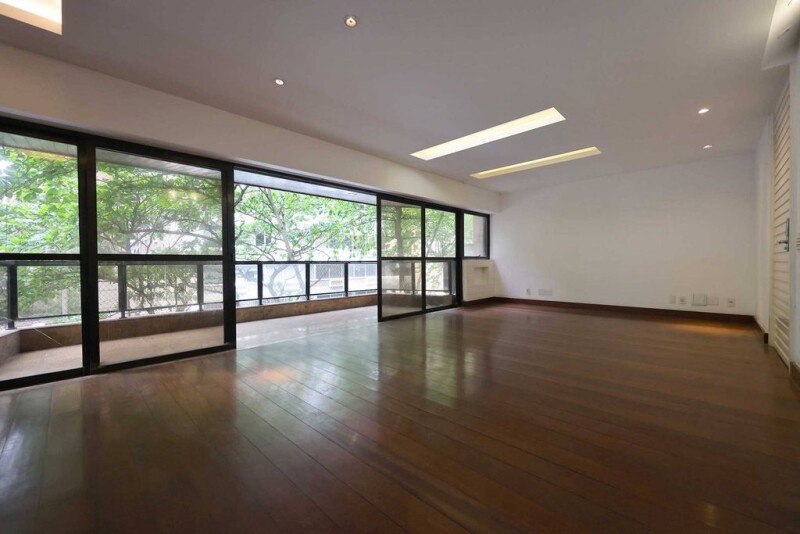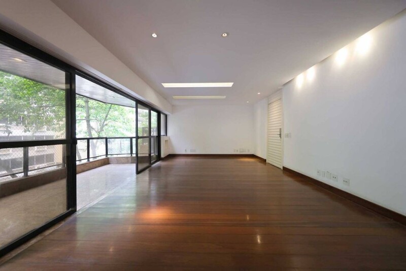 Spacious apartment located on the block from Leblon beach, close to the diverse local shops. The property features a balcony, a large living room in two environments, and a side view of the ocean. Originally with four bedrooms, it currently has three, including two suites. One of the bedrooms is used as an office, and another was opened to serve as an intimate living room, but can easily be converted back into a third Canadian-style suite. The spacious eat-in kitchen includes a pantry with built-in cabinets. The apartment comes with three deeded parking spaces. The building offers two floors of parking, a playground, a party room, and 24-hour concierge services.