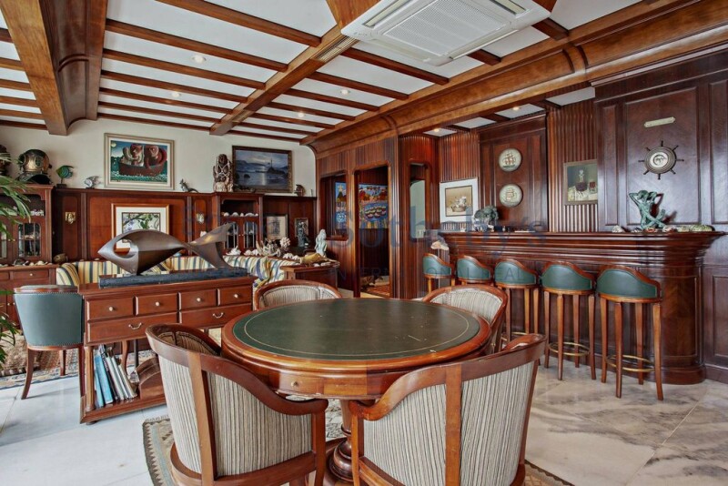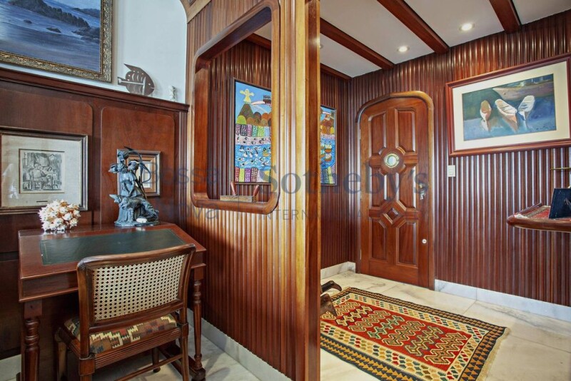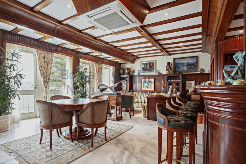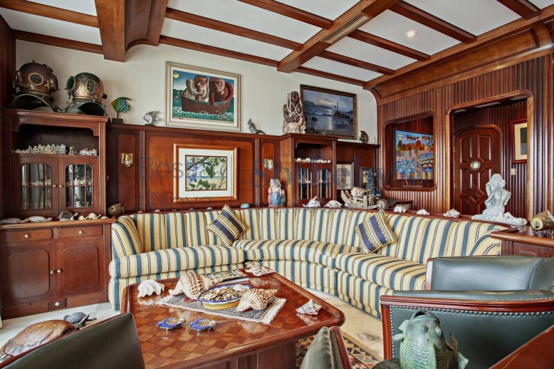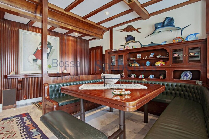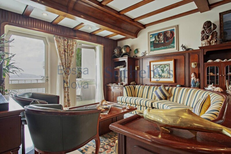 The apartment was decorated to resemble a Viking boat, the furniture was designed as a Scandinavian Nautical Replica. Original pieces from Scandinavian boats complete the decor. There is a living room for three environments integrated into the living room and dining room in the captain's style and bar, equipped kitchen and central air conditioning. Due to the location of the building, the acoustics of the waves hitting the rocks, give the feeling of being on a boat.
