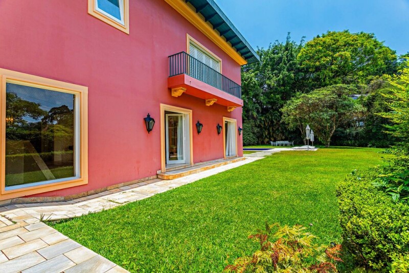 Magnificent mansion set on a 21,528 sq. ft. plot, located in the prestigious Cidade Jardim neighborhood. The residence boasts a vast social area with an elegant entrance hall and a spacious living room featuring raw Roman marble, integrating multiple spaces including a sitting room, a fireplace lounge, a dining room, a home theater, and an office. All rooms open onto an expansive terrace that surrounds the social area, offering abundant natural light and beautiful views of the neighborhood's greenery. Additional spaces include a breakfast room, a powder room, a china cabinet, and a wood-paneled library with access to a second terrace and a large swimming pool surrounded by palm trees and a solarium on the manicured lawn encircling the house. The second floor hosts the private quarters, featuring a large and sunlit master suite with two marble bathrooms, two walk-in closets, and a private sitting room. Two more suites and a convertible room that can serve as an additional bedroom complete the floor. All spaces are equipped with custom cabinetry and air conditioning. The service area includes a pantry, kitchen, storage room, china cabinet, two staff bedrooms, and a laundry room. The property also features a gym and a covered garage for six cars, with a security booth and a separate service entrance. The social entrance is highlighted by a grand hall with side staircases leading to the elegant living area. The landscaping enhances the gardens, completing the exclusive ambiance of this stunning residence.