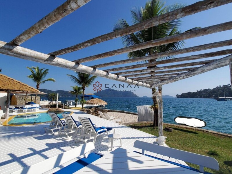 Seaside house, with a spectacular view of the sea of Angra dos Reis-RJ, in the charming neighborhood of Vila Velha. There are 10 rooms (9 suites), all with air conditioning. Full kitchen with industrial stove, living room and balcony. Outdoor area with large lawn. Swimming pool with natural stones, deck with artificial beach, boat deck with lounge. There are 5 ports, 2 of which are for large vessels and a garage for cars. The house is very cozy, being a place with beautiful sunsets! It operates as an inn today, but serves perfectly as a residence.