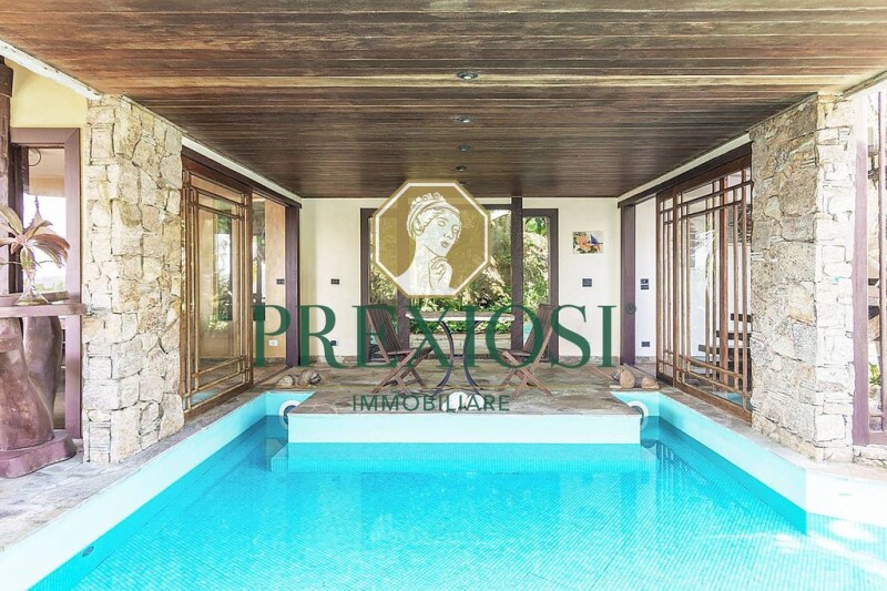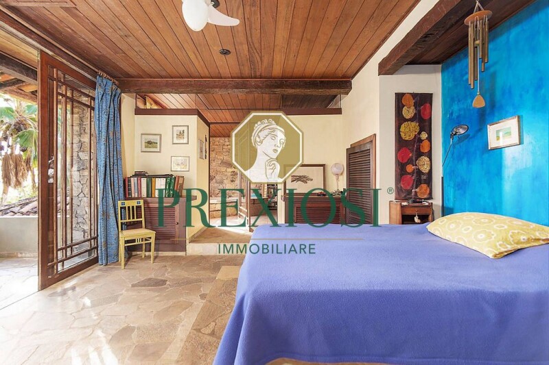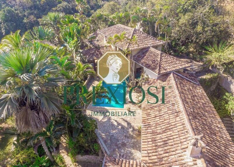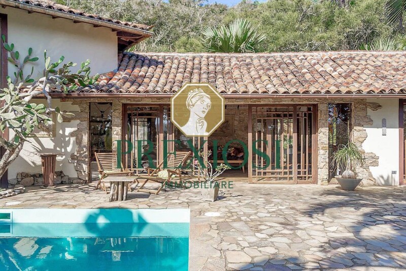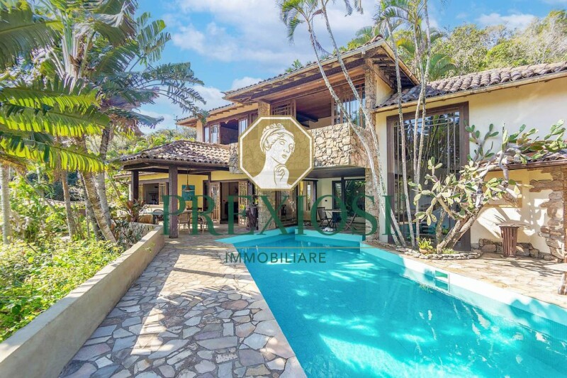 Búzios - Rio de Janeiro (Brazil) In the most popular and suggestive bay in Brazil, also known as the “Brazilian Saint-Tropez”, we offer a prestigious Villa with swimming pool and large adjacent Dependance, with breathtaking views of the Ferradura (Horseshoe) bay and the surrounding hills. The Villa, designed and built by an Italian architect in Mediterranean style with local finishes such as fine woods, natural stones and ancient tiles, is in total harmony with the nature that surrounds it. It extends from north to south, with a view of the hill to the east and the beach to the west. All the rooms are accessible from panoramic terraces that always offer new perspectives on the garden and the sea. Spectacular sunsets and starry skies can be observed. The Villa extends over three levels for a total of approximately 450 square meters. Separated from the main building is the Dependance of approximately 50 square meters. Main Level It extends along the entire length of the house, where the rooms follow one another from north to south, opening onto the paved outdoor space of the pool, with panoramic views of the garden and the bay, and the garden upstream. The entrance hall gives access to the pool and to the right to the living room with bar area, followed by the TV room with fireplace and a large bathroom; to the left you access the dining room, the kitchen, the services (laundry room with a service bathroom) and the veranda. At the end of the paved space there is a bedroom with bathroom and, going down to the intermediate level, there is a barbecue and a stone fireplace. Upper Level Accessible with a designer staircase from the living room, it is composed of a large bedroom with panoramic terrace, bathroom with Jacuzzi, shower corner, toilet corner and walk-in closet. Intermediate Level Covered area with barbecue and stone fireplace that gives access to the patio behind the house and the garden. Lower Level From the intermediate level you descend to the lower level which consists of a veranda with access to three bedrooms, each with its own bathroom, a warehouse and the garden where there is a stone fireplace and a barbecue. Dependance Adjacent to the main Villa there is a Dependance consisting of a dining room with open kitchen, patio, two bedrooms, a bathroom and a paved outdoor area. The Garden The garden surrounding the property is a true botanical garden, with a large variety of ornamental, fruit and medicinal trees and shrubs, exotic flowers, different types of orchids, bromeliads, succulents, cacti, etc. Other There is also a large parking space, storage rooms, garage/workshop, a water tower and three cisterns for collecting rainwater from the roof to irrigate the garden. The property can also be used as a tourist facility with five suites and two additional bedrooms in the Dependance.