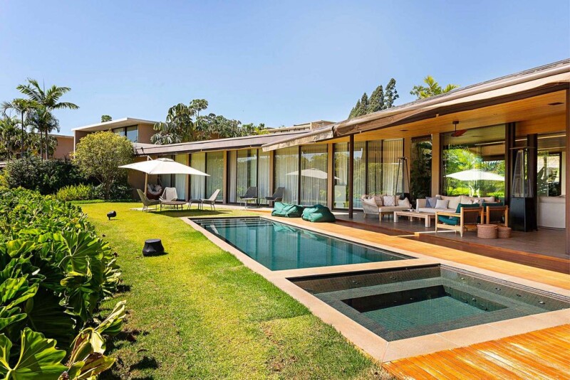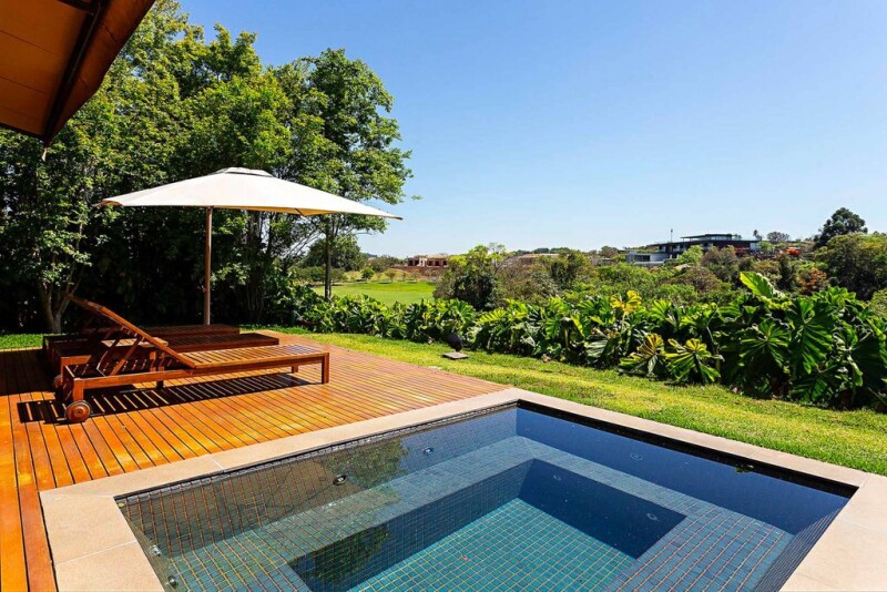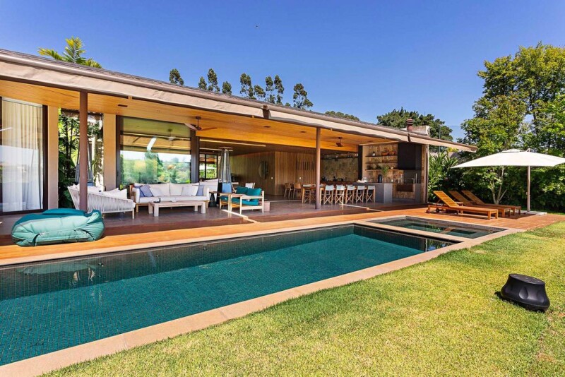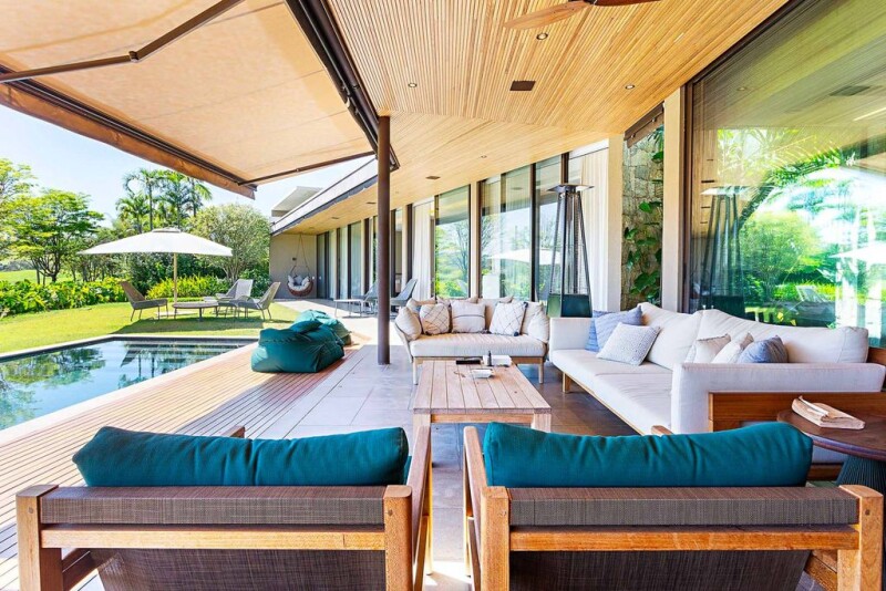 This modern house with high-end finishes is located in the Fazenda Boa Vista development. All areas are connected by a continuous terrace facing the outdoors and offering views of the golf course. The spacious living area is filled with natural light and decorated by Marina Linhares, featuring a wine cellar and sliding doors leading to the outdoor area, which includes a gourmet space, a pool, a hot tub, and a garden with landscaping by Alex Hanazaki and a productive vegetable garden. The house also includes a home theater and a powder room. The private area consists of five large, beautifully decorated en-suite bedrooms with bathrooms designed in the same style. The kitchen features a central island and high-quality custom cabinetry. Additionally, the house includes a service area with staff quarters and a bathroom, as well as four garage spaces.