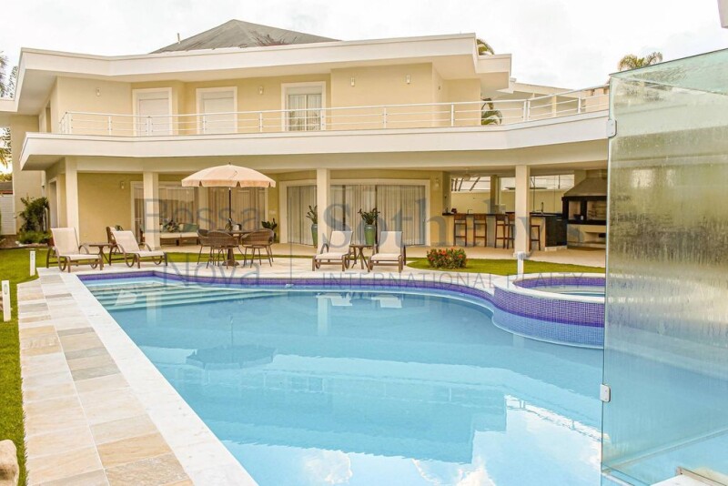 Located in the Acapulco Guarujá condominium, close to Praia de Pernambuco. The house is modern and has a living room for three environments, a dining room, nine bathrooms, air conditioning, a lavatory, a kitchen with cupboards, a solar heating system and staff's room. In the intimate area, there are six suites, all with wardrobes. In the external area, large garden, gourmet area, heated swimming pool, sauna, six parking spaces, sound system throughout the internal and external social area, including the swimming pool and private terrace on the upper floor.