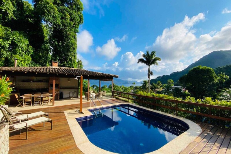 This property boasts stunning ocean views and is located in a privileged area. It offers a large outdoor space with a garage for five cars, a caretaker's house, workshop, storage room, and professionally designed landscaping. The entrance hall leads to the integrated dining, TV, and living rooms, all with ocean views. Large windows provide excellent natural light and ventilation. The house includes a powder room, a spacious kitchen with a pantry, a service area, and a laundry room. The lower level features two spacious bedrooms and a shared bathroom, as well as a veranda overlooking the pool and gourmet area. On the upper floor, there are three en-suite bedrooms, one of which is integrated with the master suite. All suites have access to a balcony with ocean views. The expansive leisure area includes a barbecue, wood-fired oven, outdoor dining area, a wooden deck around the pool with sun loungers, a steam sauna, shower, and an external bathroom. The condominium offers two private beaches, a market, marina, pier for large vessels, 24-hour security, a hotel, and more.