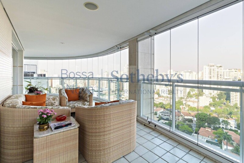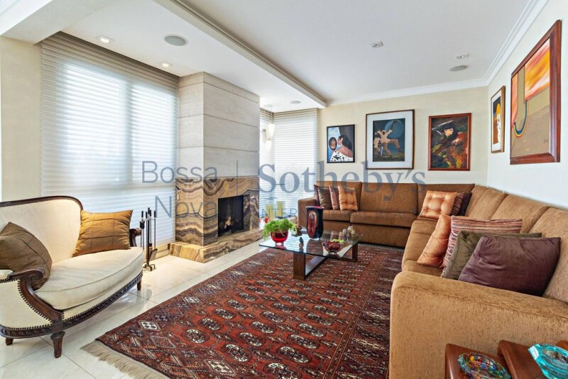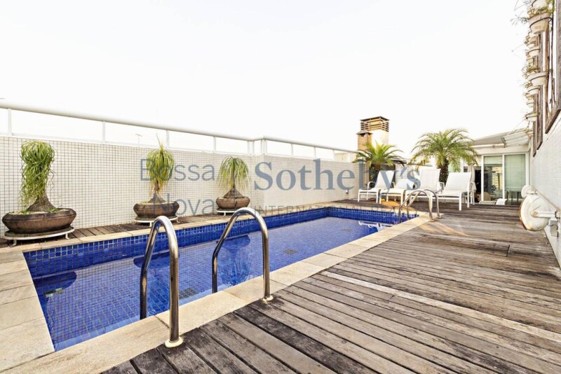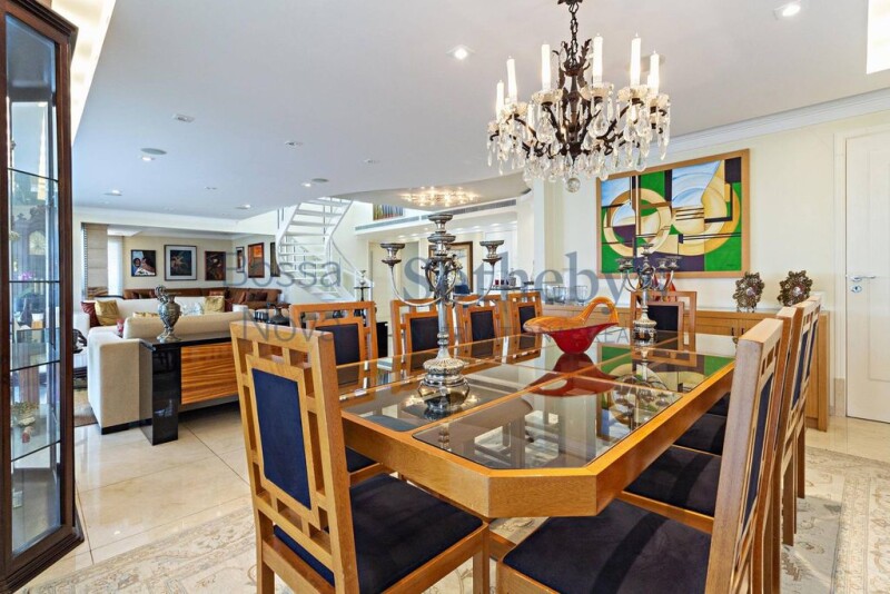 A cobertura é composta por living para vários ambientes, lareira, terraço contornando todo apartamento, lavabo, sala de almoço integrada ao terraço gourmet, cozinha com móveis planejados e área de serviço espaçosa. Na área íntima, dispõe de quatro dormitórios, sendo três suítes, suíte máster ampla com closet e banheira. No piso superior, possui jardim, piscina, churrasqueira e solarium.