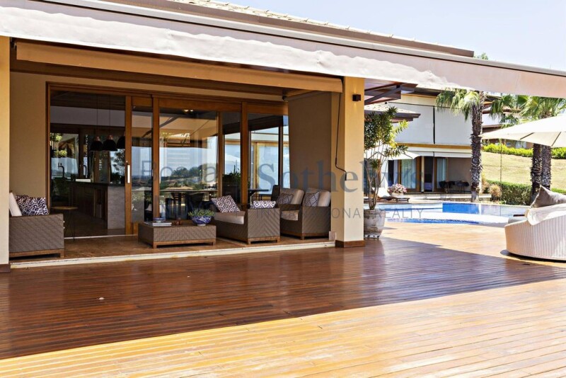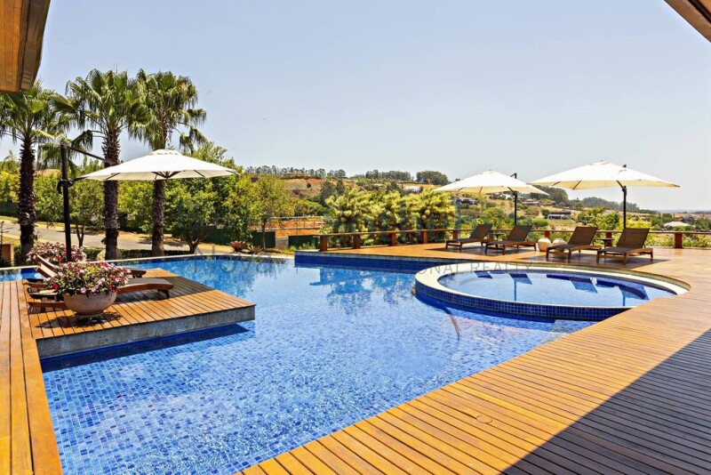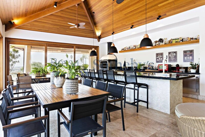 Rustic style house in Fazenda da Grama gated community with all finished in cumaru wood and pivoting door. It has five rooms, five suites, one of which is a master suite and a kitchen with cooktop and hood, integrated into the gourmet terrace. Garden view. It has a wet deck and an adult and children's pool. The view to the green areas is highlighted. There is glass in most of the house and high ceilings, providing spaciousness and brightness to all environments, regardless of the sunset position. It has landscaping with palm trees, lawn and garage for six covered cars.