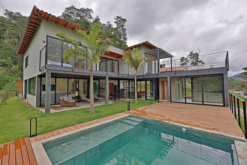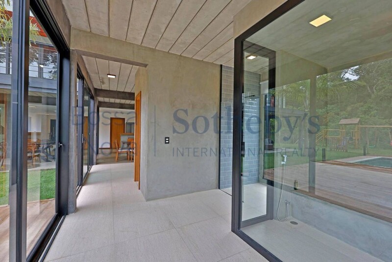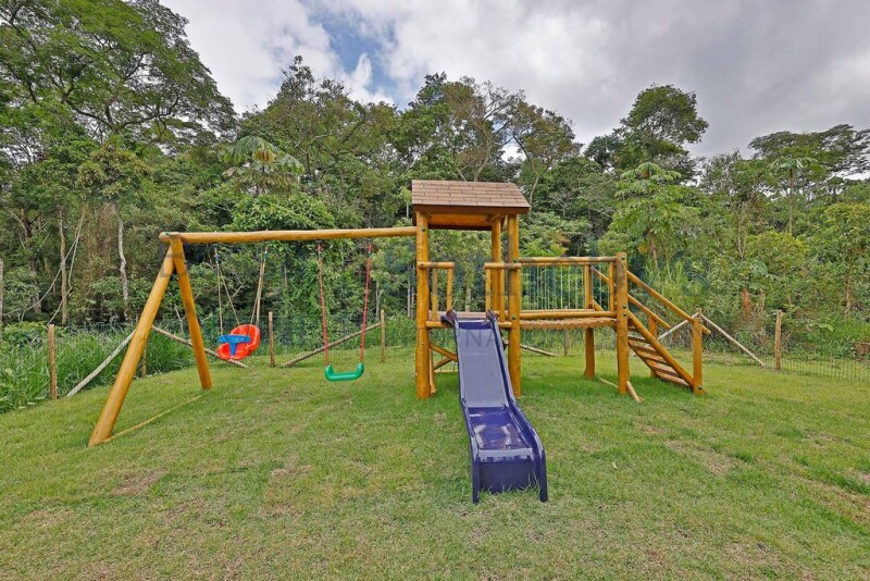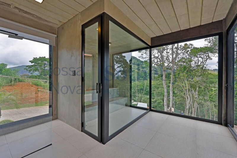 House in a gated community, with 450m² of built area, spread over two floors. Project by architect Alexandre Sodré. On the first floor, there is the hall, a lavatory, a living room with three environments with a fireplace and an open concept kitchen. On the same floor there is a suite and the laundry room. Access to the second floor is via a linear staircase, where there is a family room, an office and three suites, two with a balcony and the master with a hydromassage bath on the terrace. The frames are in black aluminum, the floor in burnt cement and the environments all have split AC. The kitchen has a barbecue and brewery. Outside, there is a swimming pool, a solarium and a playground on the lawn with toys. It also has a steam sauna, all in glass, a shower and a bathroom.
