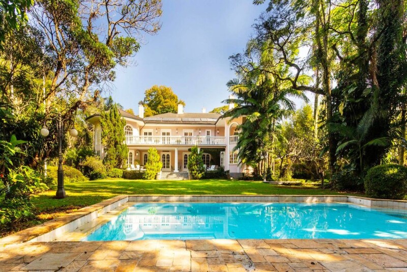 European-style house in Chácara Flora, a quiet and privileged district of São Paulo. It is located on the highest part of the community, away from gates and walls, surrounded by trees and a peaceful environment. The floorplan is very practical, full of natural light and ventilation, comprising a living area with two living rooms and a fireplace, a study with a library, a dining room, a spacious kitchen with a barbecue grill, a half bath, a bar, a wine cellar, and a covered veranda with a view of the garden, where there is a swimming pool. In the sleeping area there are five bedrooms, all en-suite and with walk-in closets, four of which have their own balconies, and an extra bedroom that can be used as a family room. The service area is completely separated from the main living space, with full employee facilities. There also is a four-car garage and an outdoor area where more cars can be parked. In addition, the water supply for the outdoor area is provided by an artesian well.