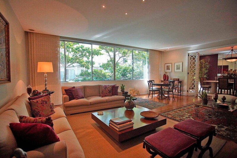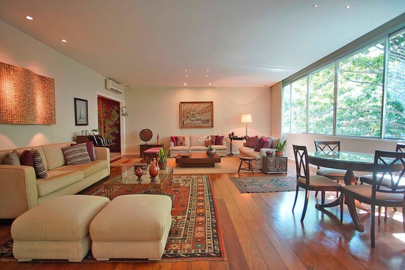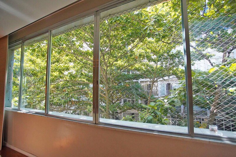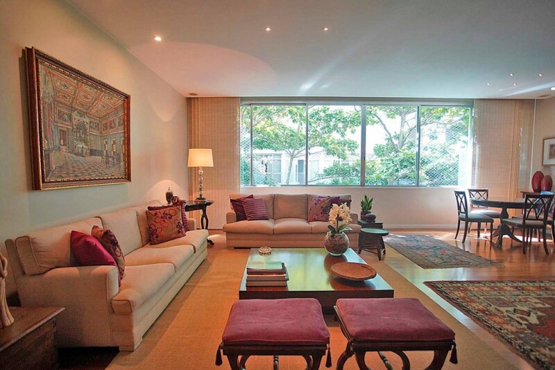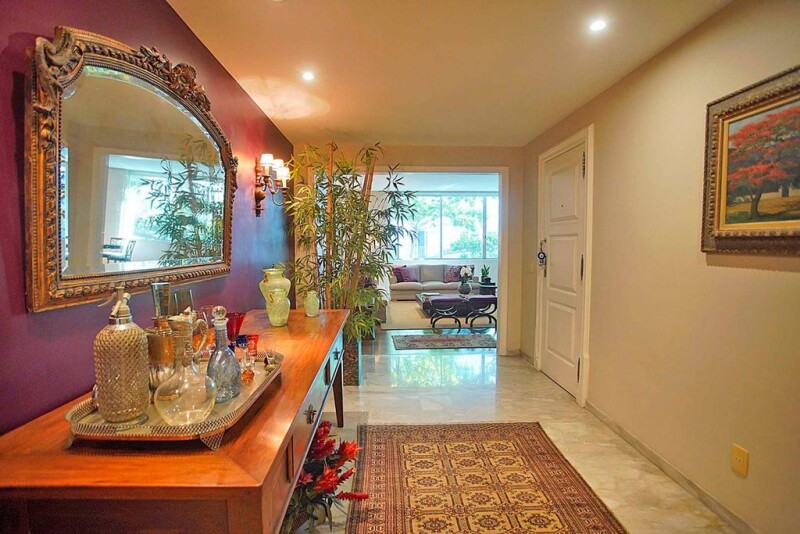 This spacious apartment is located close to Ipanema Beach, featuring bright and airy rooms, a circular layout, high ceilings, wide wooden doors, preserved hardwood flooring, and Ornare closets. The social area includes a Carrara marble entrance hall, a two-room living area, a dining room with views of the trees that provide shade and privacy from neighboring buildings, split air conditioning, and a powder room. In the private area, there are four bedrooms, including two quiet en-suite bedrooms at the back, and two additional bedrooms with a shared bathroom and built-in wardrobes. The corridor, service area, kitchen, and full staff quarters with two rooms are well-lit with windows throughout. The apartment has updated electrical and plumbing systems. The building offers 24-hour concierge service.