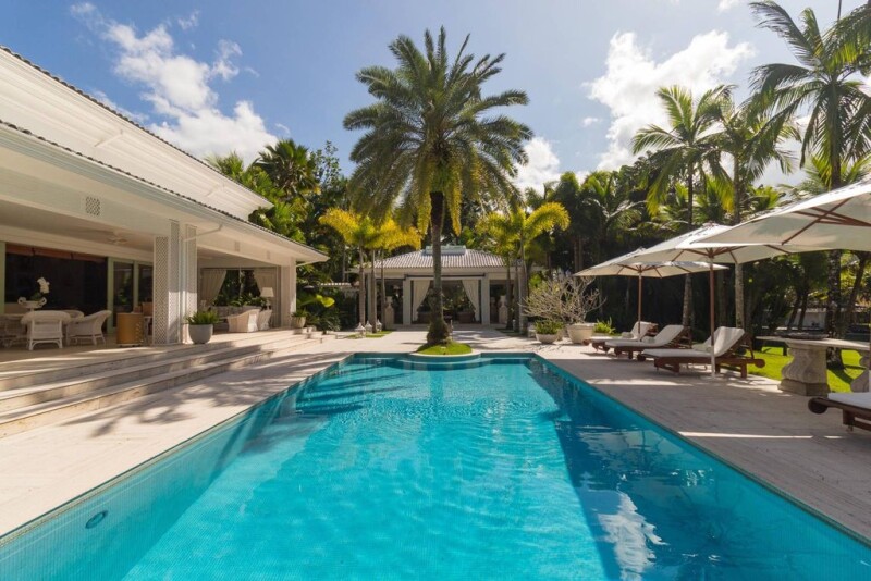 This sophisticated home is surrounded by a lush tropical garden, featuring a grand entrance hall that leads to a living area with three settings and an integrated dining room. The expansive veranda provides cozy spaces around a heated pool, jacuzzi, orchid greenhouse, and a gazebo with a gourmet area, perfect for entertaining guests. The travertine marble flooring in the social areas enhances the property's elegance. A palm-lined garden leads to the canal, complete with a private deck for boat docking. The private area offers ten suites, including a master suite with a walk-in closet and separate His and Hers bathrooms, as well as a jacuzzi. The breakfast room connects to a spacious kitchen equipped with a pantry, storage cabinets, and a freezing and defrosting chamber. The service area includes a laundry room, a staff bedroom, and a bathroom. The house is fully air-conditioned with split-system units, including in the kitchen. Additionally, the property features a separate villa for staff accommodations, ensuring comfort and functionality in every detail.