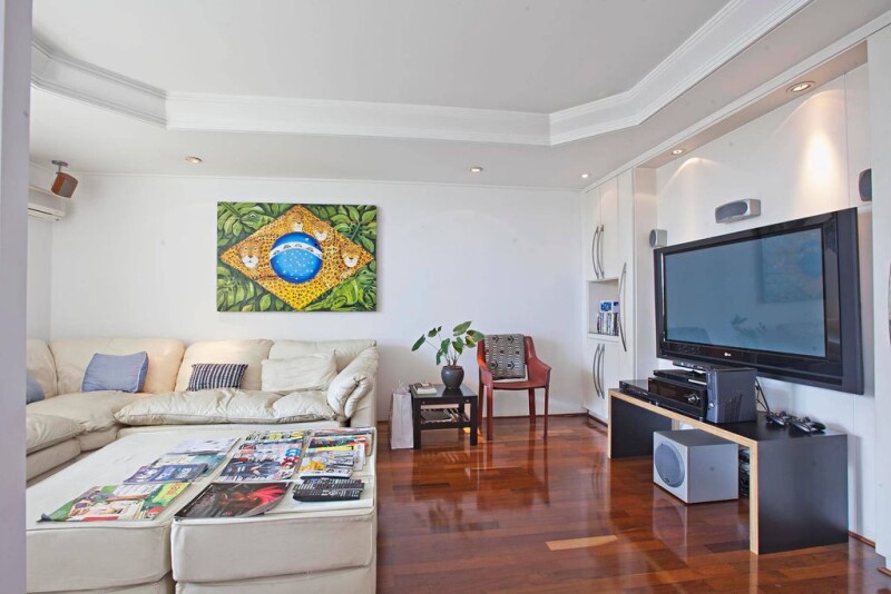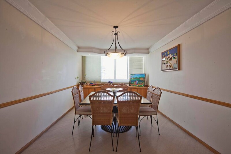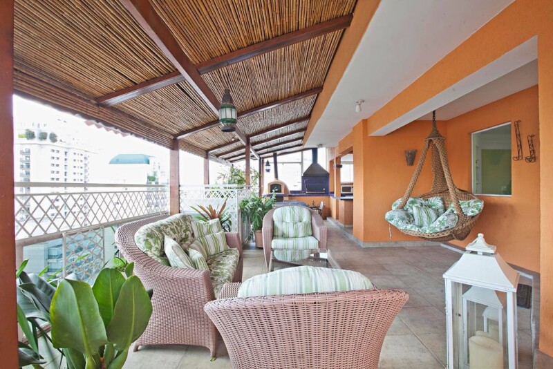 This penthouse is at a condominium in a woody street with a beautiful garden. The first floor has an entrance hall, a living area to two ambiances with a terrace, a dining room, a TV room, a lunch room, a kitchen, a laundry room, two staff quarters and a toilet. The intimate area has two wide suites and a master suite that offers an office. The upper floor holds the leisure areas, that include a gourmet area with a barbecue pit and a pizza oven, a full locker room, a billiards room and a living ambience with a fireplace.