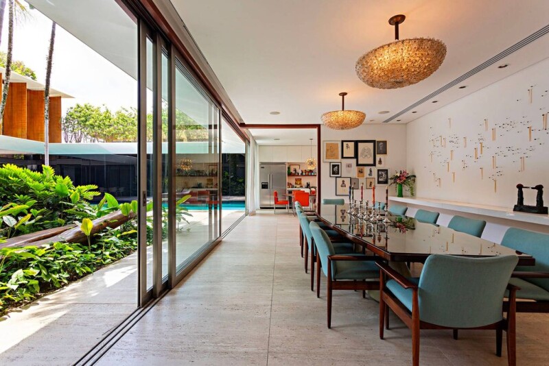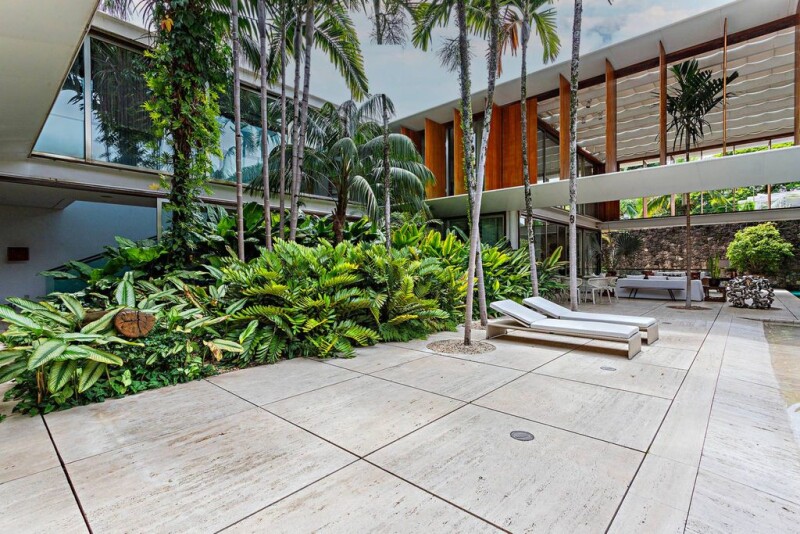Designed by the renowned firm Jacobsen Arquitetura, this three-story residence masterfully balances sophistication and functionality. Every space has been conceived to integrate harmoniously with nature, maximizing natural light and fluid transitions between indoor and outdoor areas. The ground and first floors are divided into two wings, connected by a lush garden and a central swimming pool with two lap lanes. The intermediate level features hallways enclosed by expansive sliding glass doors, maintaining visual continuity with the outdoor area through travertine marble flooring. On the upper level, floor-to-ceiling glass panels are interspersed with pivoting wooden brise-soleils, ensuring privacy and natural ventilation. The entrance hall leads to a comfortable office, a powder room, a formal dining room, a breakfast area, and a kitchen outfitted with Viking appliances. The opposite wing houses a spacious living room with dual seating areas, one indoor and the other enclosed in glass, positioned adjacent to the pool. The upper floor, finished with high-quality wood flooring, accommodates five suites. The front wing includes four suites and an intimate TV room, while the master suite, located in the rear wing overlooking the pool, features a walk-in closet and dual bathrooms, with custom cabinetry and imported Italian wardrobes. The lower level offers a professional-grade gym, a spa with a steam sauna, and a mini basketball court. The service area is strategically positioned for efficiency, with three staff suites. The underground garage accommodates up to six vehicles and includes five storage rooms. An elevator services all floors, and the residence is equipped with central air conditioning. Situated on a secure street, the home features an advanced security system, including reinforced doors at the main entrance and private quarters.