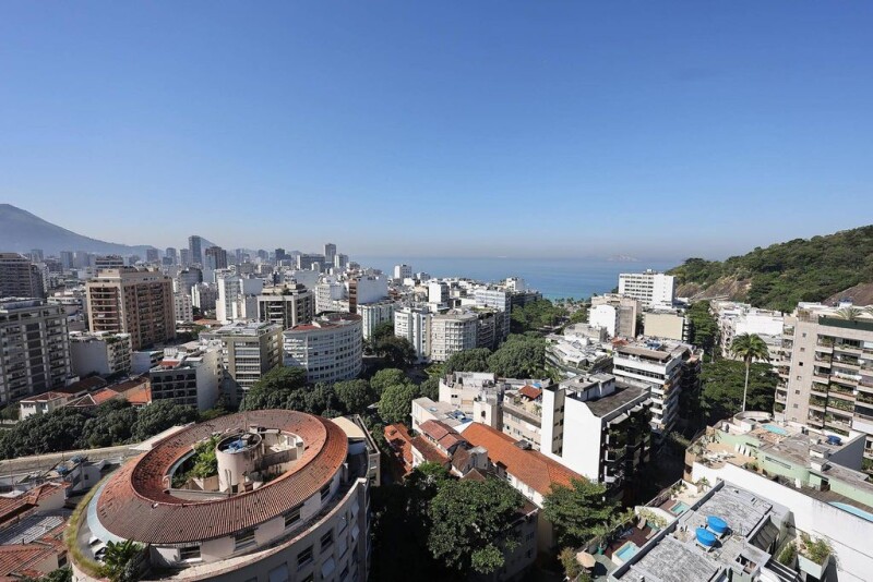 This stunning triplex penthouse spans 435 m² and offers breathtaking views of the ocean and Lagoa region. The first floor features an entrance hall, four suites—all with balconies—one of which is a master suite with a walk-in closet and ocean view, and a TV room. The bathrooms are adorned with Travertine marble, bathtubs, and peroba rosa flooring. Access to the second and third floors is via a linear staircase and elevator. The first floor also includes a pantry kitchen, storage room, staff quarters, and a service bathroom. The service area has a spiral staircase providing internal access to the other floors. The second floor boasts a living room, dining room, home theater, and a bathroom, all with Travertine Romano marble flooring. The outdoor area features a balcony with a pool, a gourmet space with a barbecue, refrigerator, chair broil, and a dumbwaiter. There is also a laundry area at the back. The third floor includes another gourmet space with a table, wood-fired pizza oven, oven, ice machine, refrigerator, dry sauna, powder room, outdoor shower, and a hot tub. Enjoy views of the lagoon and beach. The entire home is automated with voice control. The property includes two deeded parking spaces and 24-hour security.
