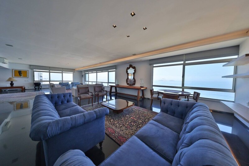 With 5,791 sq. ft. of space and unobstructed, front-facing ocean views, this high-floor apartment is located in one of Ipanema’s most iconic and sought-after buildings. The only unit currently available in the condominium, it offers panoramic 360-degree views with complete privacy and refined design. The entrance hall leads to a grand living area with four distinct spaces, a wine cellar, and a powder room, all finished in marble flooring. It also includes a fully equipped home theater, three spacious suites, and an additional room that may serve as a pantry or linen closet. The expansive primary suite features exclusive access via a second social elevator, a large bathroom, and individual closets for each partner. The kitchen is both functional and well-equipped, with two pantries and a full service area that includes two staff rooms and a bathroom. The apartment includes four deeded parking spaces, along with additional guest parking. The building offers a party room, fitness center, and 24-hour security with full surveillance.