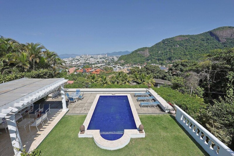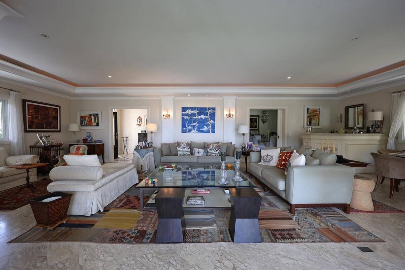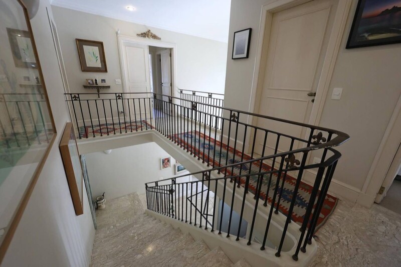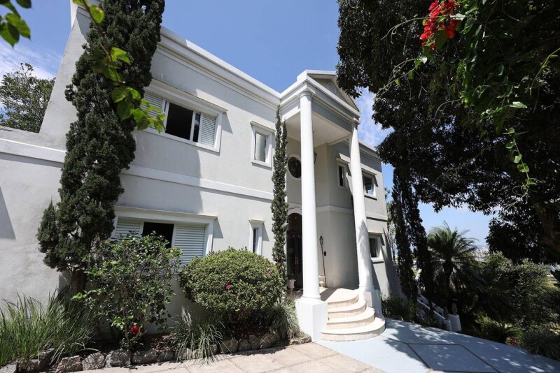 Exceptional two-story house in Joá, featuring a spacious veranda that connects seamlessly to the interior. The first floor includes a living room, dining room, powder room, TV room, and a kitchen with a breakfast area, pantry, and dish cabinet. A linear staircase in the entrance hall leads to the second floor, which houses five suites. Two of the suites are interconnected, forming the master suite with a walk-in closet and a private balcony. Two other suites are in the Canadian style, one of which also features a walk-in closet. At the back of the property, a staircase leads to a garden with fruit trees. The property includes three parking spaces, and the gated community provides 24-hour security.