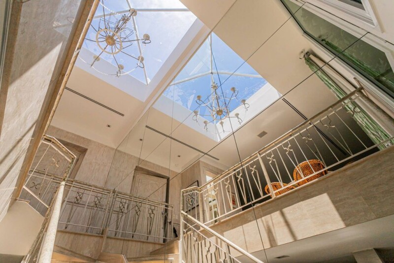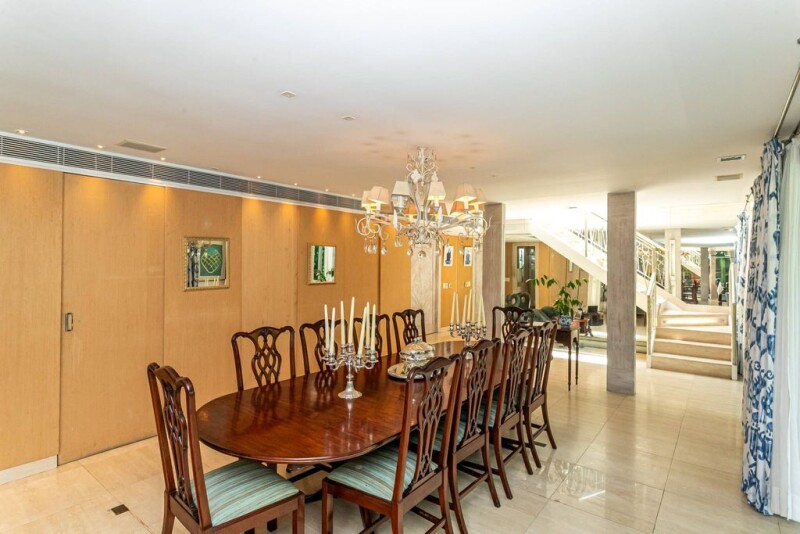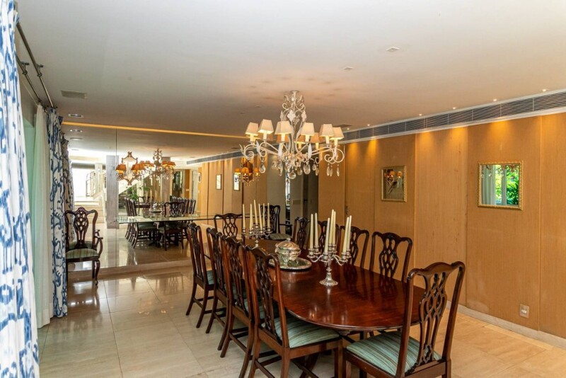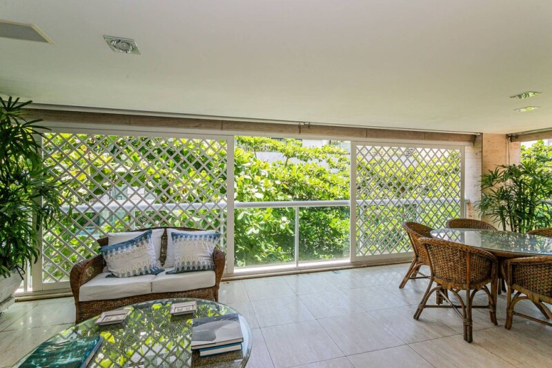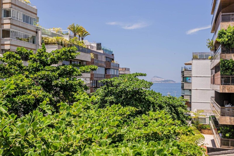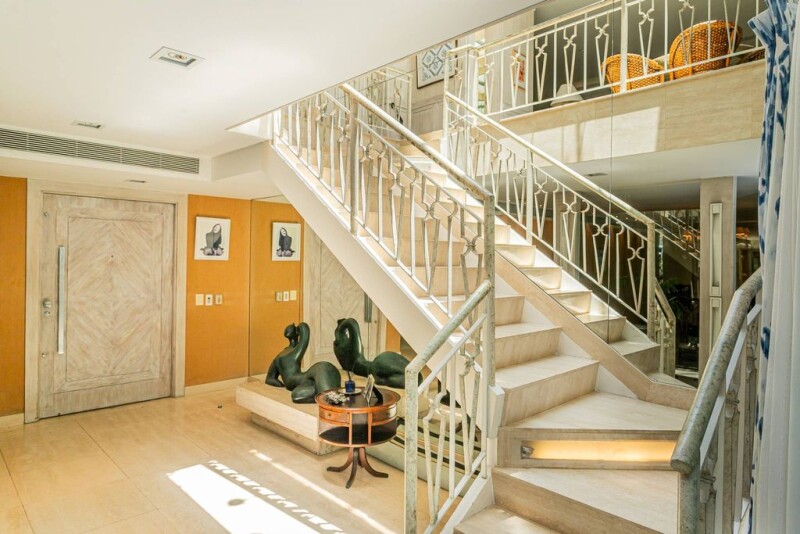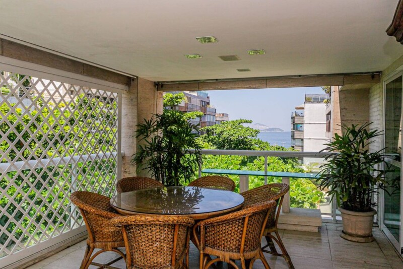 This stunning 5,920 sq. ft. duplex penthouse is located just one block from Leblon Beach, in a well-maintained building with 24-hour concierge service. The first floor features a spacious balcony with a side ocean view, a dining room with travertine flooring, a powder room, and three suites with balconies, including a master suite with a walk-in closet and an office. The functional layout includes a planned kitchen, a breakfast area, and a service area with full staff quarters. The circular floor plan ensures a seamless flow between spaces. A linear staircase with a charming skylight leads to the second floor, where a large living area with multiple spaces opens onto another expansive balcony with a side ocean view. This level also offers a powder room and an additional suite with a walk-in closet. The outdoor area is an oasis, featuring a private pool, a synthetic grass garden, a support kitchen, and breathtaking views of Morro Dois Irmãos. The building amenities include a party room, a gym, and a multi-purpose sports field with synthetic grass. The property comes with four parking spaces.