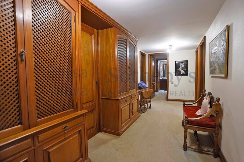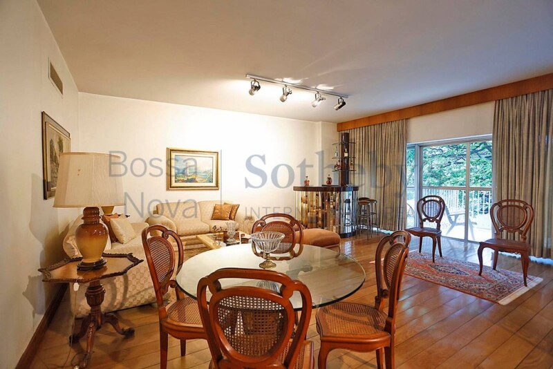 Spacious apartment on a quiet, tree-lined street. Large balcony overlooking trees, entrance hall, lavatory, living room for three environments with hardwood floor, separate dining room, family room sharing the four bedrooms, two of which are suites. All bathrooms in the suites and the guest room are spacious. Kitchen with space for an island, service area, two staff quarters. Plan with several possibilities for architect to reconfigure. Central air conditioning. Grated building with 24-hour concierge, playground and three parking spaces in the deed.