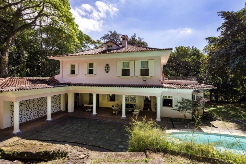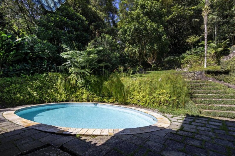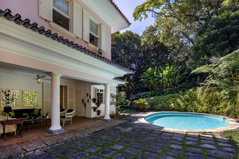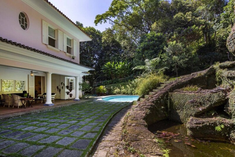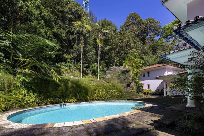 Beautiful mansion with huge 5000 square meter outdoor area is for Sale in Alto da Boa Vista. The 500 square meter mansion possesses 2 bedrooms including 1 suite. Located in Alto da Boa Vista, from which you have fast and easy access to Sao Conrado and Barra da Tijuca. The condominium has a 24/7 security. Noble building with high ceilings and a marble entrance hall with a staircase leading to the second floor. On the ground level there are a big living room, a paneled library, dining room, guest toilet, ample kitchen, pantry, front and back terraces, with a huge tiled mural by the artist Athos Bulcão. On the first floor there is 1 bedroom en suite with closet, ample bathroom and veranda, plus 2 other bedrooms with closets and another ample bathroom. The landing also has closets. There is a front balcony. The house has 2 dens, both of which can work as a storage spaces. Elegant garden with swimming pool, 3 small lakes and an ample terrace. 5000 square meter outdoor area surrounded by huge trees for maximum privacy. Several fruit trees and lots of space for a vegetable garden. Dog kennel with room for 2 large dogs. Outdoor oven for dried leaves. On the back of the house there is a smaller 2 story-house. On the ground floor there are a 2 car garage, laundry, a small toilet for staff, plus another small room. The second floor, used for staff, has a small living room, 3 bedrooms and 2 bathrooms.