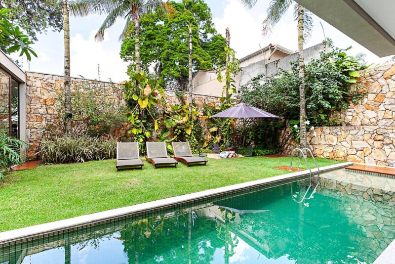 House with a bold contemporary project designed by Vitor Penha, located in a prime neighborhood of São Paulo. It has a robust construction by Alle Engenharia all made in prestressed concrete, without pillars, promoting total integration between the environments, which are full of sophisticated details, such as large floor-to-ceiling glass doors and windows that allow the entry of plenty of sunlight, without losing any privacy due to the placement of the building. From the entrance hall it is possible to see the entire living area, consisting of a living room with double-height ceilings, a dining room, a large balcony with gourmet space and an outdoor area with garden, swimming pool and sauna, as well as an opulent “pub” space with wine cellar. On the top floor there is a home office space with a small break area and four well-distributed bedrooms with en-suite bathrooms, one of which is the master bedroom, comprising two closets and two bathrooms. There also is a rooftop overlooking the neighborhood, an underground garage and a spacious home theater room with a big screen and a view of the bottom of the pool. The house is fully equipped with air conditioning, automation and a backup generator.