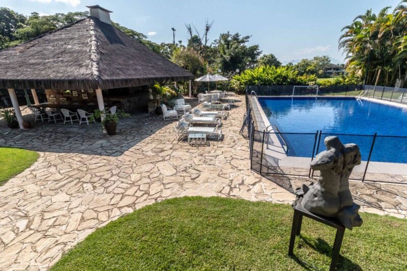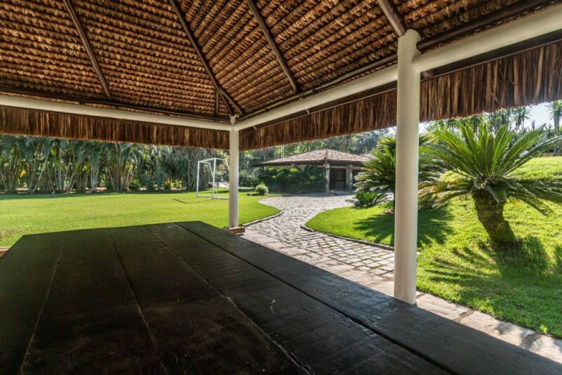 This mansion for sale features 13 bedrooms on a flat 55,972 sq. ft. lot, located in the Porto Frade Condominium. The spacious living room is divided into several areas and includes a winter garden, adding a special touch to the space. The main house offers four en-suite bedrooms, a fully equipped kitchen, a game room, and a winter garden. The service area is well-organized and includes staff quarters. The property boasts a large, grassy garden, a soccer field, a 1,400 sq. ft. pool, a sauna, and a charming kiosk with a gourmet area, equipped with a barbecue and pizza oven, perfect for leisure moments. The garage accommodates over six vehicles. In addition to the main house, the property includes two guest houses and two annexes, each with two bedrooms, a shared bathroom, and a living room. Located near the golf course, this property offers complete privacy, providing a peaceful and secluded environment for its residents.