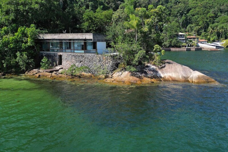 This house on a peninsula boasts stunning views and was designed by the renowned architect Paulo Mendes da Rocha, recipient of the Pritzker Prize, the Nobel of Architecture. The property is located in a bay with views of Serra da Bocaina and over 25 nearby islands with paradisiacal beaches. Accessible by coastal highway and sea, the house sits on a granite rock peninsula offering 180º views of the sea, islands, and mountains, surrounded by beautiful gardens with native Atlantic Forest plants. The property features a living area with two integrated spaces, a kitchen, and access to the outdoor area with breathtaking views of the surrounding nature. It includes five bedrooms, one of which is a suite, all with ocean views. The property also has internal monitoring, Wi-Fi, three sea accesses with decks and clear, crystalline waters. An annex for staff includes two bedrooms, two bathrooms, a living room, a kitchen, and parking for three cars.