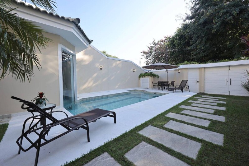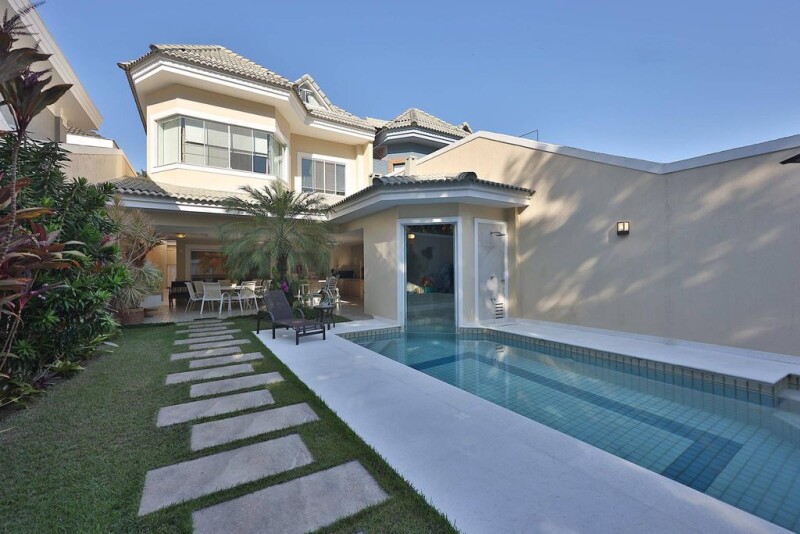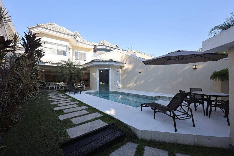 This beautiful house is located in a gated community with a private street and security. On the first floor, the living room is divided into two areas, featuring a covered veranda, gourmet area with a support pantry, barbecue, and wood-fired oven. There is also a dining room, powder room, kitchen with custom cabinets, service area, laundry room, and full maid’s quarters. Access to the second floor is via a straight staircase, where you find four suites, all with built-in wardrobes and new split air conditioners, with the master suite including a walk-in closet and whirlpool tub. The third floor, also accessed by a straight staircase, includes a TV room, playroom, and another master suite with a whirlpool tub. The outdoor area features a swimming pool, steam sauna, bathroom, and garden. The property offers 24-hour security and armed guards.