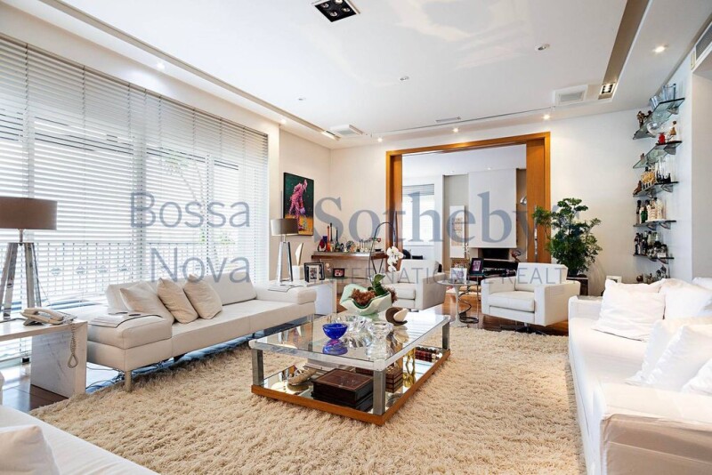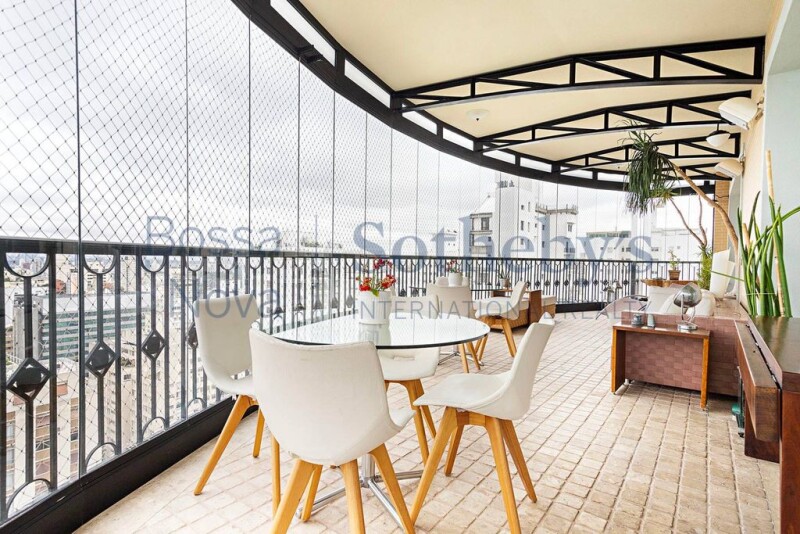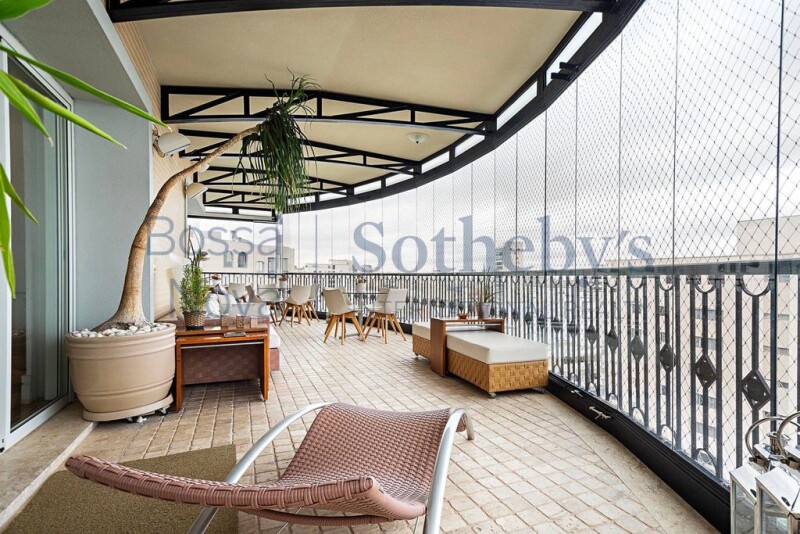 High-rise apartment with a contemporary and timeless design in a building with only one apartment per floor. It has bright rooms and a functional floor plan, with two elevators, an entrance hall and a foyer with marble flooring. The living area has wood plank flooring and comprises a wide sitting room, a balcony with several environments and a gourmet area overlooking a panoramic view, a media room with a home theater setup and a fireplace, and a dining room. There also is a breakfast room, a kitchen and a pantry. The woodwork of the entire apartment is top-of-the-line. In the sleeping area there are three bedrooms, all with private bathrooms, one of which is the master bedroom, with two closets and a spacious bathroom with a bathtub and a vanity table. The bathrooms are all in marble. In addition, there is a linen closet and facilities for two employees. The building offers a full gym, an indoor heated swimming pool, a party hall, a lobby with double-height ceilings, five parking spaces in the garage, a private storage room, and specialized security.