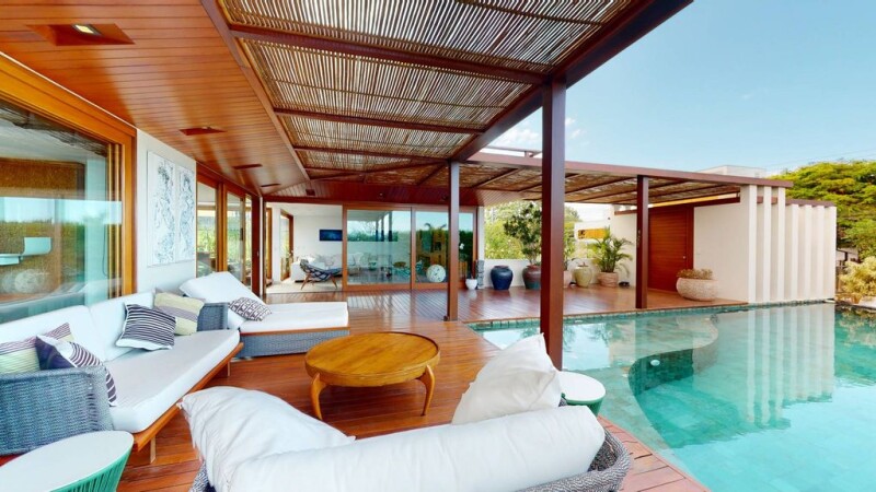 High standard house in the best condominium in Porto da Lagoa Location One of the best gated communities in Lagoa da Conceição, Vilas do Porto offers a lot of comfort and benefits to its residents such as janitor, 24-hour doorman and security system. The leisure area has tennis courts, soccer, beach tennis / beach volleyball, and next to a kiosk with barbecue. Access to the beach is via an ecological trail that leads to Joaquina beach. The property House designed by the renowned architect, Ivo Mareinês, and executed in the best standard with openings in solid wood. The inspiration is oriental with many references to Bali, Indonesia. The ground floor The entrance to the house is stunning, with lots of plants and a swimming pool all lined with Balinese stones. We have many external openings integrating environments with lots of harmony and natural lighting. In addition to the TV room, dining room, office and kitchen, on the ground floor there is a guest room that can be completely isolated, creating a spacious environment for guests. Upper floor On the upper floor, the house has 3 suites, all with balconies and views of the sea. Lower floor, basement In addition to a covered garage for 3 cars, we have a suite that is now used as a sewing workshop. On this floor we also find a large room that the owners use to store their belongings. The possibility of acquiring the land next to the house, which belongs to the same owner.