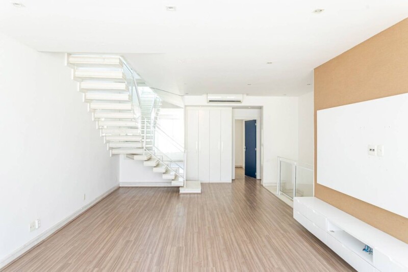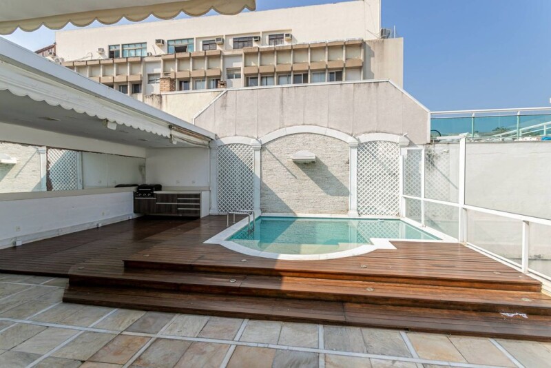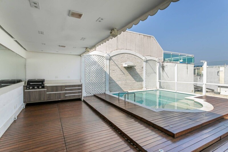 This 340 sq. m. triplex penthouse offers a modern and functional layout. The first floor features a living room, TV room, powder room, two suites, a kitchen, and a service area. The second floor includes another TV room and three additional suites. On the third floor, a spacious terrace houses a pool, barbecue area, kitchen, and bathroom. The two-room living area connects to the second floor via a sleek linear staircase. The property includes one deeded parking space. Recently renovated, the penthouse is conveniently located near the beach and General Osório Square Metro Station, offering easy access to restaurants, supermarkets, and pharmacies. The building is intimate, with only four floors and no 24-hour concierge service.