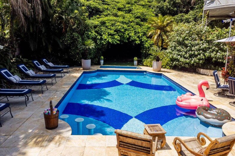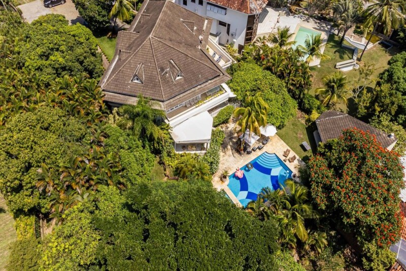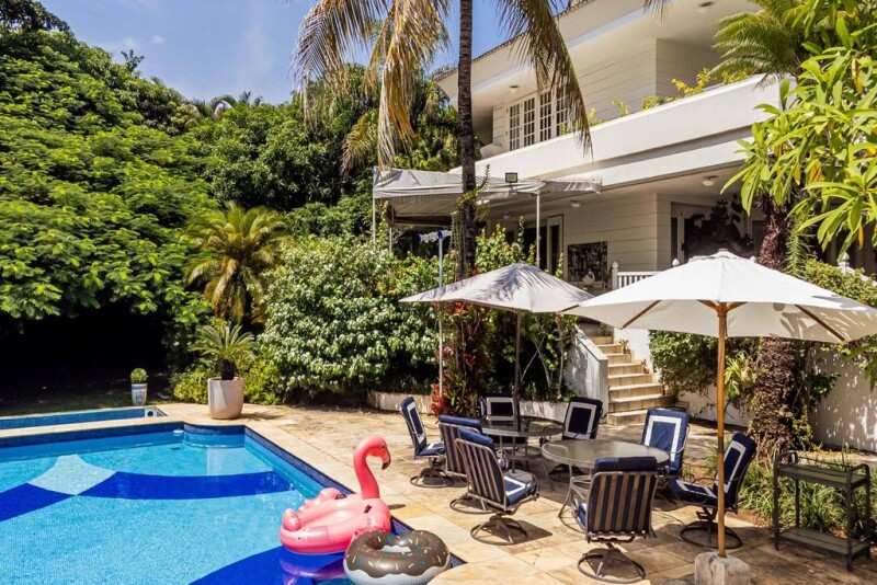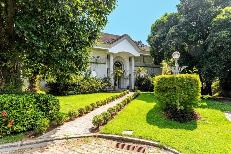 Located inside a high-end gated community with 24-hour security, this house features at its entrance a garden and a stone path that leads to the main door, with a glass portico, behind which there is a foyer with double-height ceilings and travertine marble floors. This space gives access to the garage and the living area of the house, which has a circular floor plan and wooden plank flooring. It comprises a half bath, a dining room, a living room, an office space with bathroom, and a second living room with piano and projection screen. The main living area gives access to a porch with tables and chairs, which is connected to the kitchen through a breakfast nook. The outdoor area features a swimming pool for adults and children, surrounded by a luscious garden, as well as a meditation corner with a water fountain, a space for a playroom and a lawn. The pool area also has a kitchen with a counter, bar and barbecue grill. In addition, there is a dog kennel and a laundry room outside. The second floor of the house comprises four bedrooms with private bathrooms and balconies. The master bedroom has a closet and bathroom with a jacuzzi tub. In the attic there is a large room that can be turned into a gym. In the basement there are three more bedrooms with bathrooms destined for employees. The garage has space for eight cars. The gated community offers infrastructure such as a tennis court, sports court, playground and gourmet space with barbecue grill.