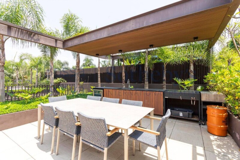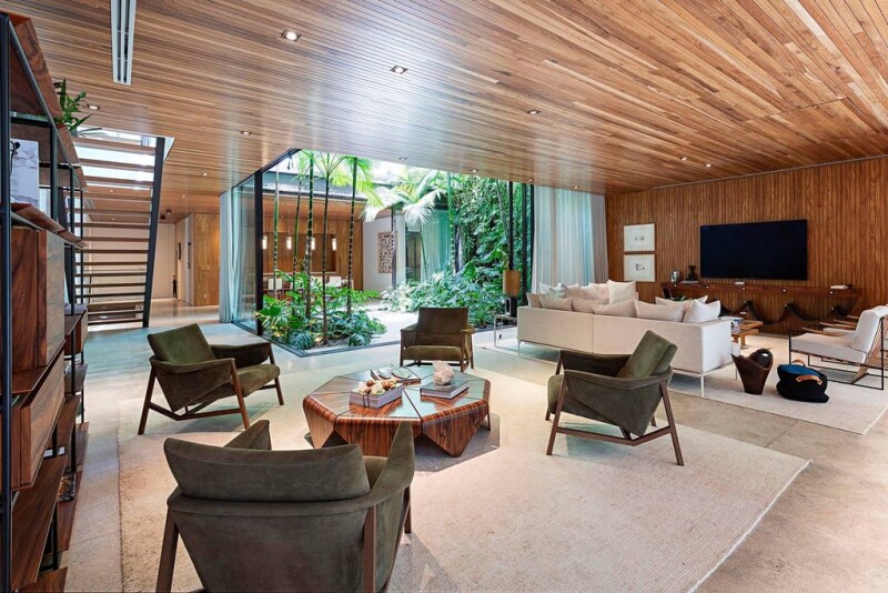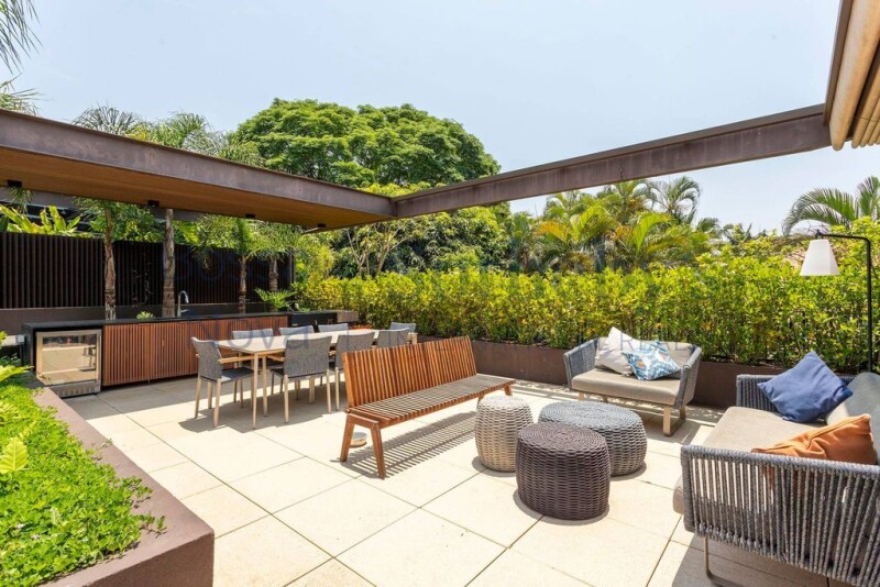 House located in Alto de Pinheiros, one of the most leafy and peaceful neighborhoods in São Paulo, full of wide streets, parks, leisure areas, schools and shops. The project sought to balance the living spaces and private areas, both with generous gardens that feature a dense and naturalistic landscape design signed by Rodrigo Oliveira, with an architecture of pure lines that confers timeless elegance and stylish modernity at the same time. The use of wood is one of Paulo Jacobsen's trademarks, and in this house it is the protagonist, providing a welcoming and comfortable aura. The living room has fully integrated environments, with floor-to-ceiling glass sliding doors that lead to the outdoor area, where there is plenty of greenery and natural lighting. There are two gardens, one with jabuticaba trees and a fire pit, the other with a green wall with automatic irrigation. The rest of the living area comprises a dining room, a home theater, a half bath, and a kitchen with Kitchens cabinets. In the sleeping area there is a family room and four bedrooms with en-suite bathrooms, including a master bedroom with closet, His andHers bathroom and office space. All bedrooms have balconies. In the basement there is another bedroom with acoustic treatment, which is now being used as a game room and home theater. Wardrobes and cabinets are from Ornare. On the rooftop there is an outdoor area with a retractable roof, comprising a lounge area, a gourmet space with barbecue grill and a solarium with jacuzzi tub. The house has a service area, full employee facilities, storage room, elevator that serves all floors, except the rooftop, full home generator, solar heater and gas boiler. The rooms have lighting and sound automation. There is an underground garage for six cars and one motorcycle, including a space with electric charging. In addition to the gardens, the condominium's common area offers a swimming pool and a gym, full backup generator, parking for visitors and 24-hour security.