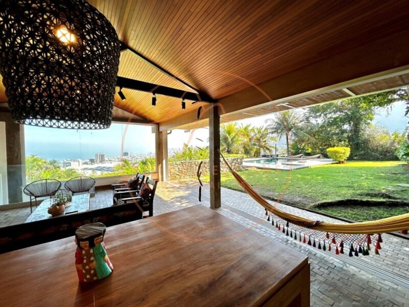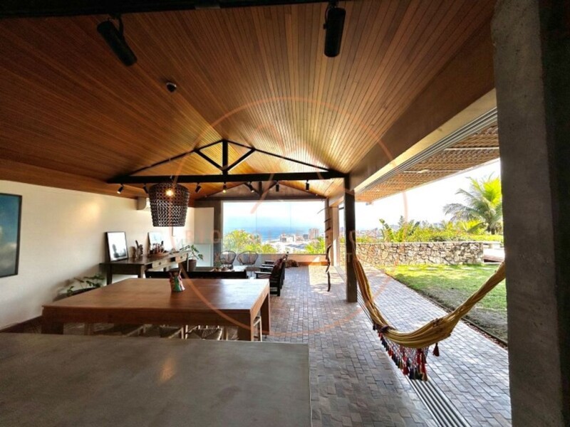 Cozy and airy house with 04 bedrooms and many spaces spread over 05 floors. On the first floor, independent dining room, kitchen, toilet, laundry room. Second floor has large living room with high ceilings and winter garden, TV room with and balcony. Going up to the third floor we have the master suite, 02 other bedrooms, 01 suite, small living area and guest bathroom. A large solarium with views of the sea and the mountains welcomes us on the fourth floor, which also has 02 offices, 01 bathroom and 01 guest room. The top floor surprises us every minute, an extensive green area with lawn, fruit trees, swimming pool, sauna, covered leisure area with barbecue, support kitchen and toilet. An incredible view with 180 degrees of sea, mountains, sky and lots of green. The house also has 03 parking spaces and solar panels.