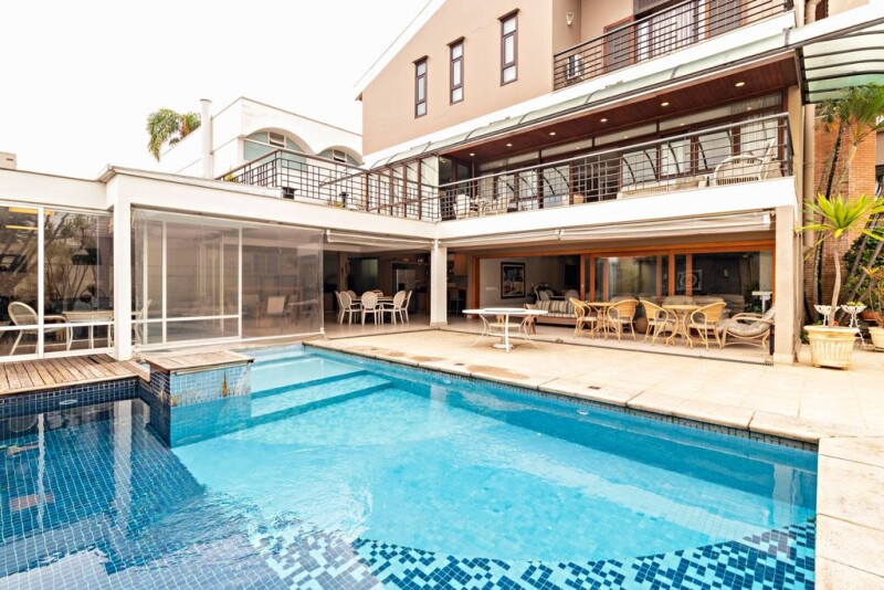 House in a gated community in refined Alphaville’s Residencial I lane, the only community with exclusive access to the Alphaville Tennis Club, and easy access to Castelo Branco Highway. The ground floor has independent social and side entrances and living room for three environments: fireplace, terrace and dining room. There is also a toilet, a TV room, a lunch room, a kitchen, service area and two pantries. The upper floor has five suites, an office and a kitchen. There is also an independent entrance to the guest suite and two rooms for employees’ use with a sitting room and bathroom, as well as a large garage with space to store materials. The kitchen, toilet and external shower support receive acoustic treatment. The leisure area includes a lounge divided into four areas: living room with fireplace complementary to the outside area, room with a 34 ”monitor for video games, games room and bar, and home theater with a 60” screen, toilet and cellar. It also has a swimming pool, sports court, gym, snooker table and gourmet space with barbecue and pizza oven.