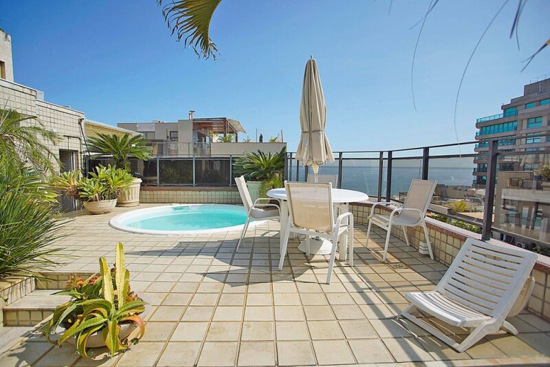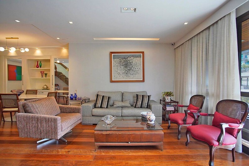 Duplex penthouse located one block away from the beach of Ipanema. The first floor features a living area with three rooms, a large balcony with views above the treetops that reach the sea and the Christ the Redeemer monument, a half bath, three bedrooms, one of which has an en-suite bathroom and a closet, a guest bathroom, a kitchen with custom cabinets, a service area and employee facilities. On the second floor there is another living room with bar area, a bedroom, an office space, a guest bathroom, a laundry room and a terrace with swimming pool and sauna, as well as a privileged view of the surrounding landscape. The building has an impressive architecture, with a kids playground, in addition to offering three parking spaces in the garage.