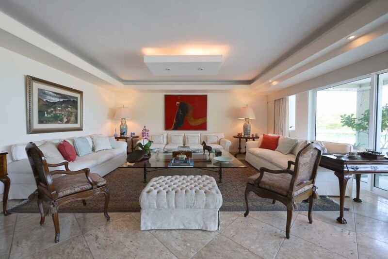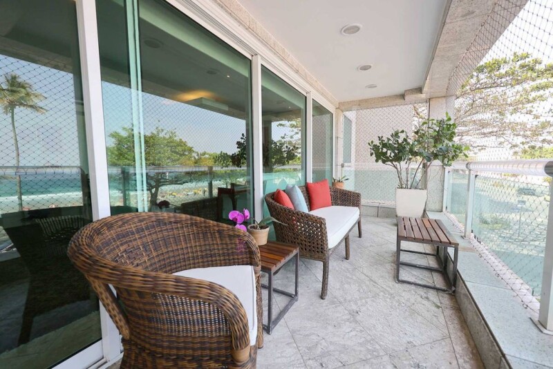 Excellent apartment in a prestigious building. The entrance hall features a double-height ceiling and a panoramic elevator that goes up to the play area. The property boasts a large living room with multiple seating areas and a balcony with ocean views, as well as a half bath. There is an intimate living room that leads to the bedrooms. Originally with five suites, it now offers four, including a double master suite facing the ocean, with a balcony, walk-in closet, and bathroom with a jacuzzi. There is also a kitchen with a breakfast nook, a large service area, two maid's quarters, and a service bathroom. The apartment includes built-in closets in all rooms, along with a pantry and luggage storage. The living room is equipped with central air conditioning, and the bedrooms have split systems. The building offers a storage room for each apartment, a party room, meeting room, gym, sauna, and hot tub. Four garage spaces on the deed and 24-hour concierge service.