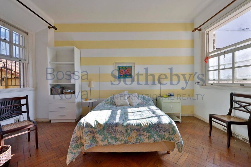 Waterfront colonial-style house in Rio, with a view of the Corcovado and Pão de Açúcar mountains. Outside, there is a marble-floor patio surrounded by several plants and fruit trees, such as a banana tree, a Surinam cherry tree and a coconut tree, facing the Guanabara bay. Inside, the first floor comprises a porch area, an entrance hall, a living area with two rooms and double ceilings, a TV room with an ocean view, and a dining room, as well as a kitchen with a separate breakfast room, a laundry room, two employee bedrooms and a service bathroom. In addition there is a back garden and a storage room. On the second floor there are three bedrooms, one of which has a private bathroom, a closet and a balcony with a view to the Corcovado mountain. Finally, there is a spacious guest bathroom with Italian marble flooring and an indoor garage for one car, as well as outdoor parking for one extra car.