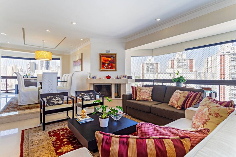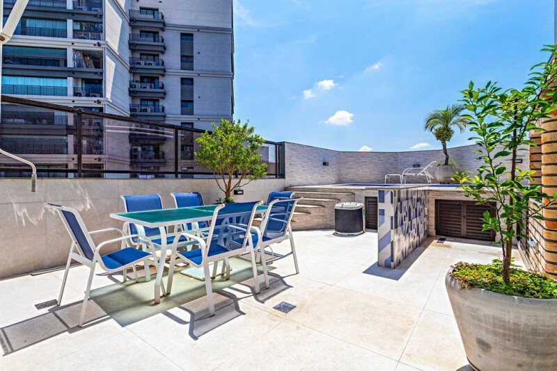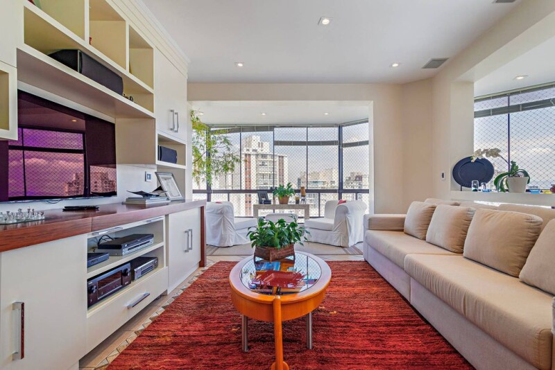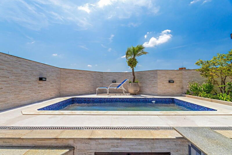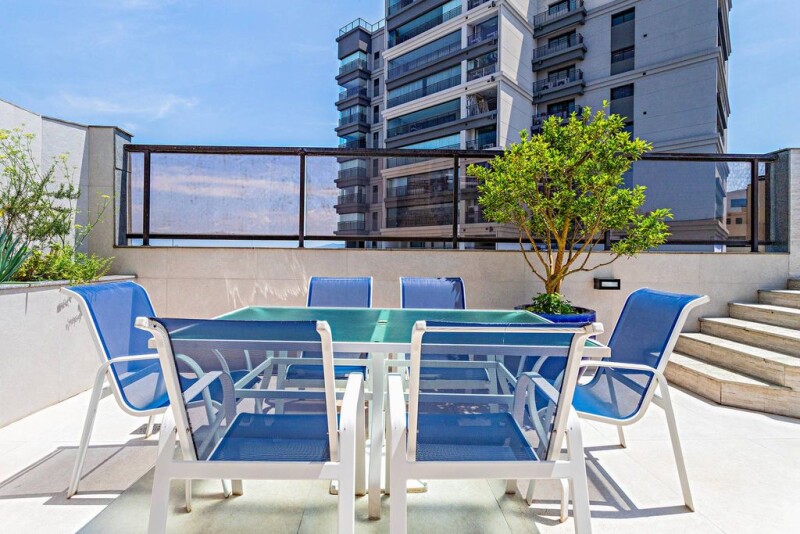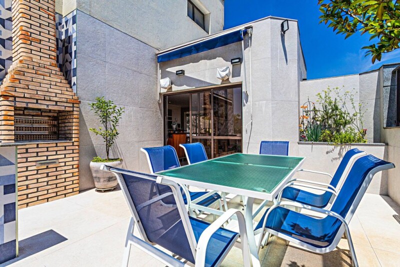 Located on the most desirable street in the neighborhood, this penthouse is in excellent condition and offers four suites and four parking spaces. The lower level features a spacious living room with a fireplace, surrounded by glass-enclosed balconies. This floor also includes two suites—one with a walk-in closet—along with a kitchen and home office. All bedrooms have balconies and air conditioning. The upper level is dedicated to leisure, featuring a private pool, gourmet area, large lounge with a bar, an additional suite, and a second office. The property also includes full staff quarters.