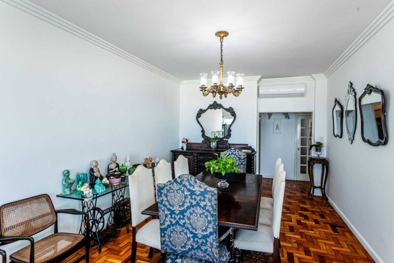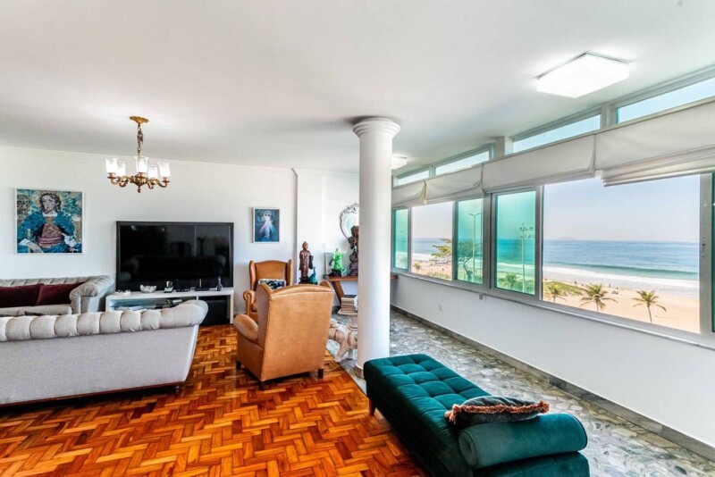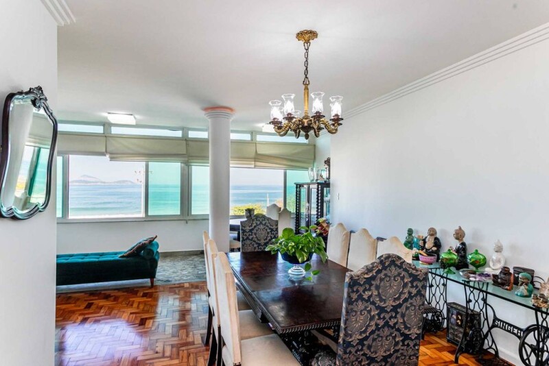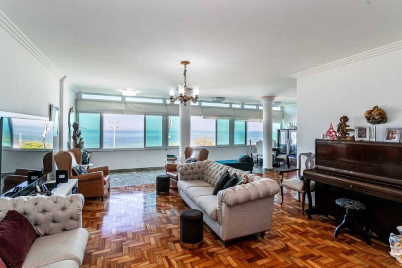 This oceanfront apartment at Posto 10 on Ipanema Beach offers panoramic views from Arpoador to the end of Leblon. Located in the most prestigious part of the neighborhood, it is close to top restaurants and designer shops. The property features a private marble foyer, a living room with three distinct areas: lounge, dining, and an enclosed balcony. It also includes a powder room, a spacious kitchen, a laundry area, and full staff quarters. The private area offers four bedrooms, two of which are en-suite. The building provides 24-hour concierge service, one deeded parking space, another allocated via the condominium, and a driver's room in the basement, along with a storage unit.