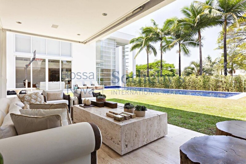 Contemporary house with interior design by Marcia Bueno Netto and landscaping by Gilberto Elkis. Built on a plot with almost 1,500 square meters, the house features large spaces, including living room with a fireplace, dining room, bar and TV room with a home theater setup, all integrated with a porch that is next to a garden with a swimming pool. There also is a barbecue grill, a gym and a dry sauna. In the sleeping area there are five bedrooms with en-suite bathrooms, an office, a TV room and a small kitchenette. The master bedroom has a double-vanity bathroom. In addition, the house has an elevator, a backup generator and an artesian well. The gated community has 24-hour security.