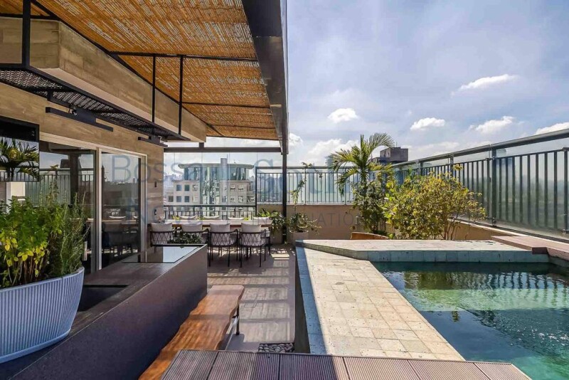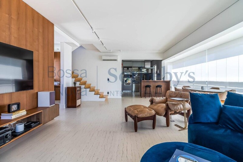 Penthouse for sale in Itaim Bibi with a wide view and an outdoor area that is next to the living room and has just been renovated. It has a barbecue, kitchen with cooktop, table with eight chairs, Palimanan stone pool and deck. Just the right size for entertaining and enjoying the great outdoors. Originally with three suites, all with a balcony, the apartment was renovated and today the master suite houses two bedrooms, one of which has been transformed into a walk-in closet. The second bedroom is a studio. It is possible to reverse this setting. With a wide view, which takes in part of the Ibirapuera Park, the roof is close to several restaurants and all the best that Itaim Bibi can offer. It has four covered parking spaces, two of which are free.
