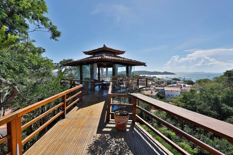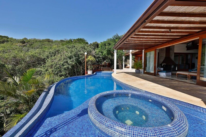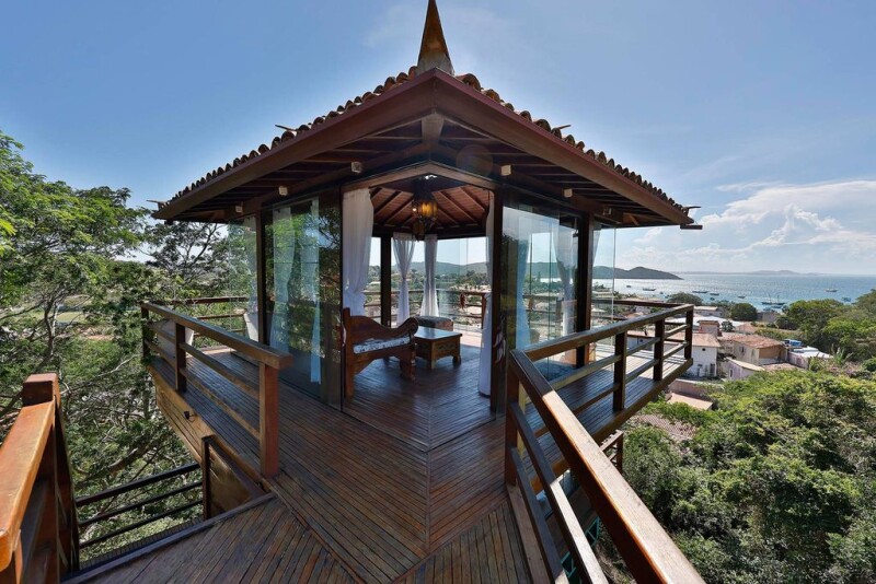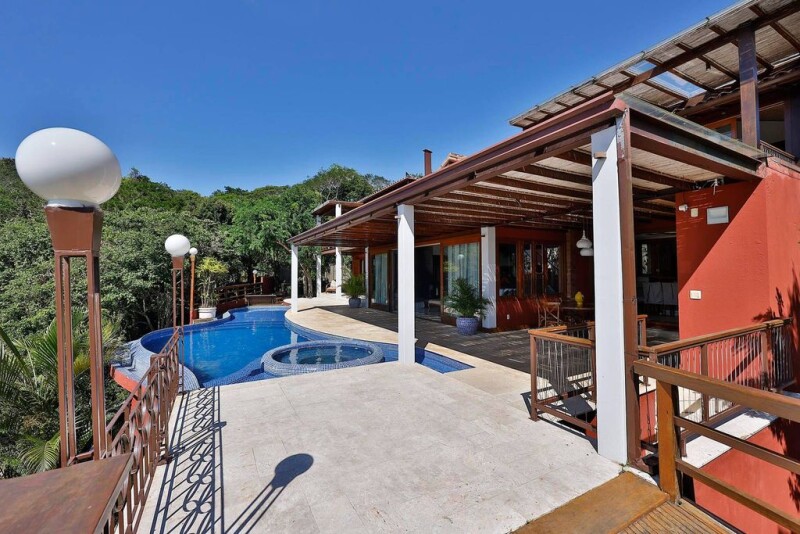 Beachfront house on high ground overlooking Praia dos Ossos, in Búzios, with a Balinese-style architecture and a reflecting pool at the entrance. The house features a three-room living area with a fireplace, a home theater room and a gourmet area with a barbecue grill that opens onto the balcony. On the same floor there are two bedrooms and a bathroom. The upper floor comprises two more bedrooms with a balcony, one of which is the master bedroom. There are two other bedrooms with a living room on the lower floor. The outdoor area includes a swimming pool with a sinuous design and a hot tub. Down the stairs next to the pool, there is a bathroom, a steam room and a spacious lounge with a bar and a wine cellar, where a nightclub is also located. Furthermore, the property has an annex that is connected to the main house by a wooden bridge, comprising a living room and a bedroom, with a view of the beach. Going further down the property, there is another gourmet space with a barbecue grill and a pizza oven, as well as a basketball court.