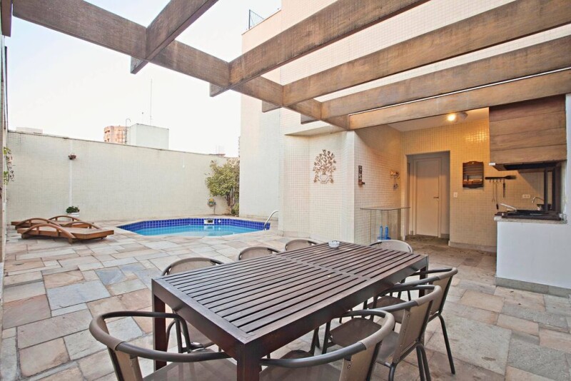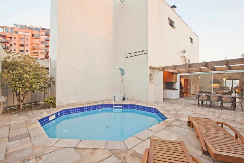 This well-lit, airy penthouse is perfect for those who love to entertain. The first floor holds a wide living area, a TV room, a fireplace, a kitchen, a service area with a staff quarter and an intimate area offering a suite and a master suite with a closet. The upper floor has two living rooms, a support kitchen, bathrooms, staff quarters and an excellent external area with a pool and a barbecue pit.