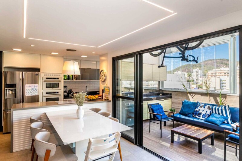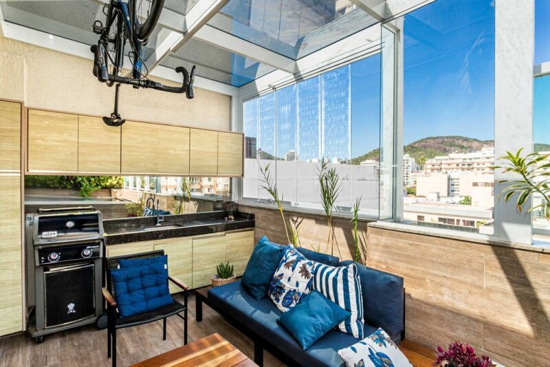 This excellent renovated duplex penthouse is located in the most sought-after area of Botafogo, offering stunning views of Christ the Redeemer. The 1,937 sq. ft. space is divided across two floors. The first floor features a foyer with a kitchenette that leads to the private quarters, comprising three bedrooms, two of which are en-suite, and a shared bathroom. The master suite includes a balcony and a home office. Access to the second floor is via a linear staircase with a glass railing. The upper level features a powder room, a living room, a TV room, and a dining room with an integrated kitchen. The outdoor area includes a terrace with a glass roof, a gourmet space with a barbecue, a heated pool, and a vertical garden wall. Additionally, there is a laundry room and a service bathroom on this floor. The penthouse is serviced by an elevator that reaches both floors and comes with two deeded parking spaces. The building offers 24-hour concierge service.